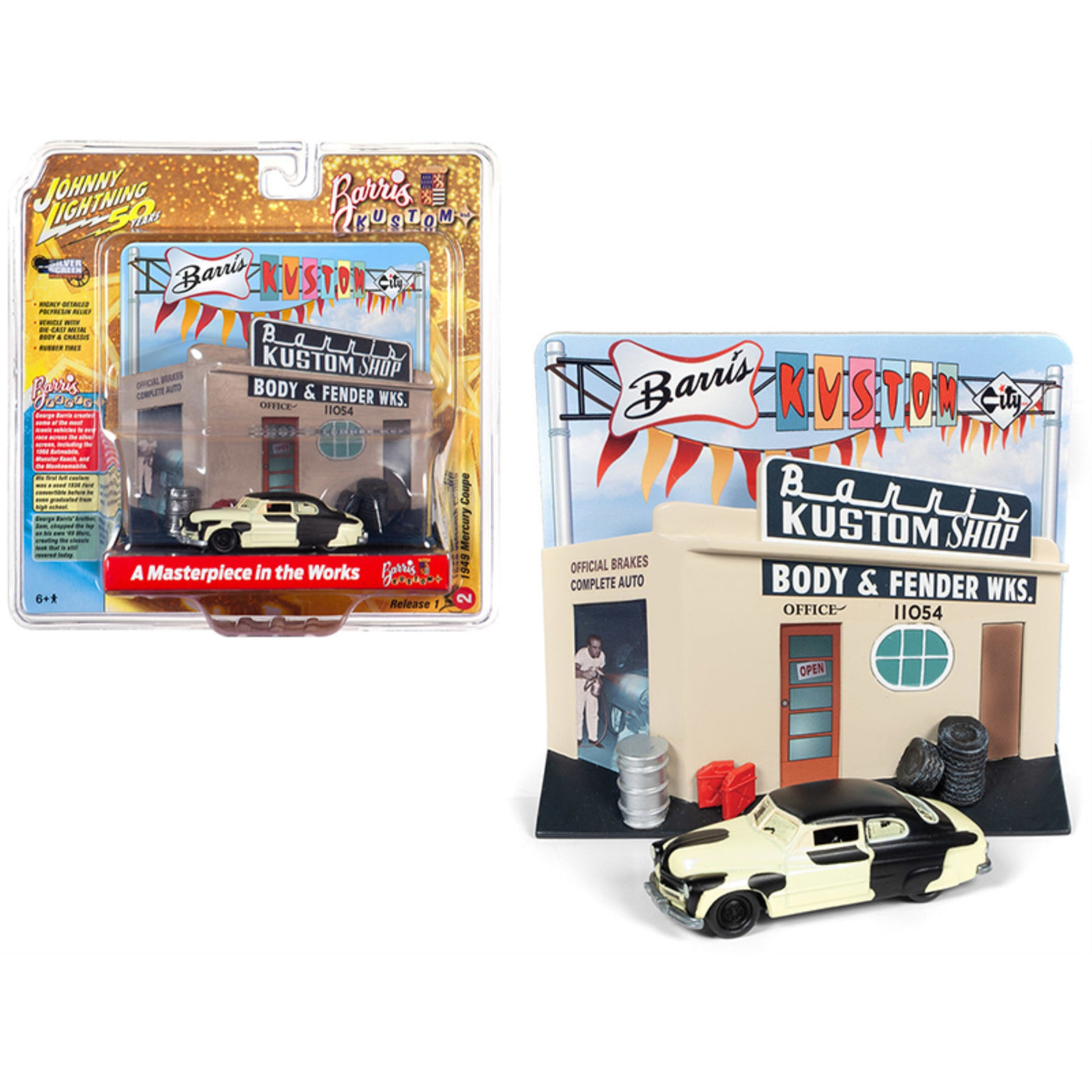 1949 Mercury Coupe Project Car With Barris Kustom Shop Facade Diorama Johnny Lightning 50Th Anniversary 1/64 Diecast Model Car By Johnny Lightning
