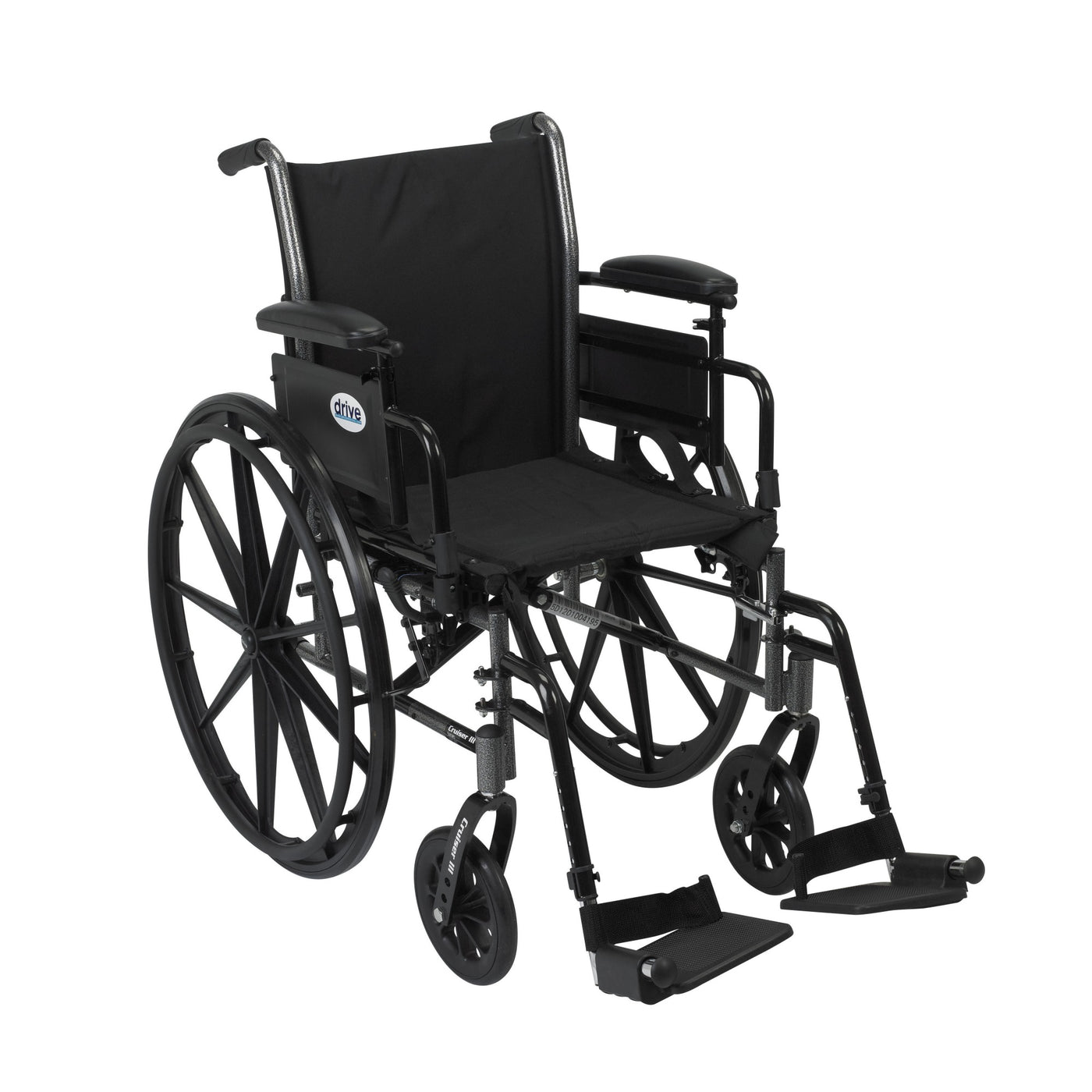 The 16 Cruiser Iii Wheelchair With Flip Back Detachable And Adjustable Height Desk Arms And Swing Away Footrests By Drive Medical Has A Carbon Steel Frame That Eliminates Seat Guides And Allows For Custom Back Inserts And Accessories. The Silver Vein Finish Is Attractive And Easy To Maintain. The Precision Sealed Wheel Bearing, In Front And Rear, Ensure Long Lasting Performance And Reliability, While The 8 Front Caster Wheels Provide A Smooth Ride Over Most Surfaces. The Dual Axle And Removable, Flip Back, Desk Arms Makes Transferring Easy. Comes Standard With, Detachable Flip Back Adjustable Desk Arms, Swing Away Footrests, Black Nylon Upholstery, Composite Mag-Style Wheels And Push To Lock Wheel Locks.