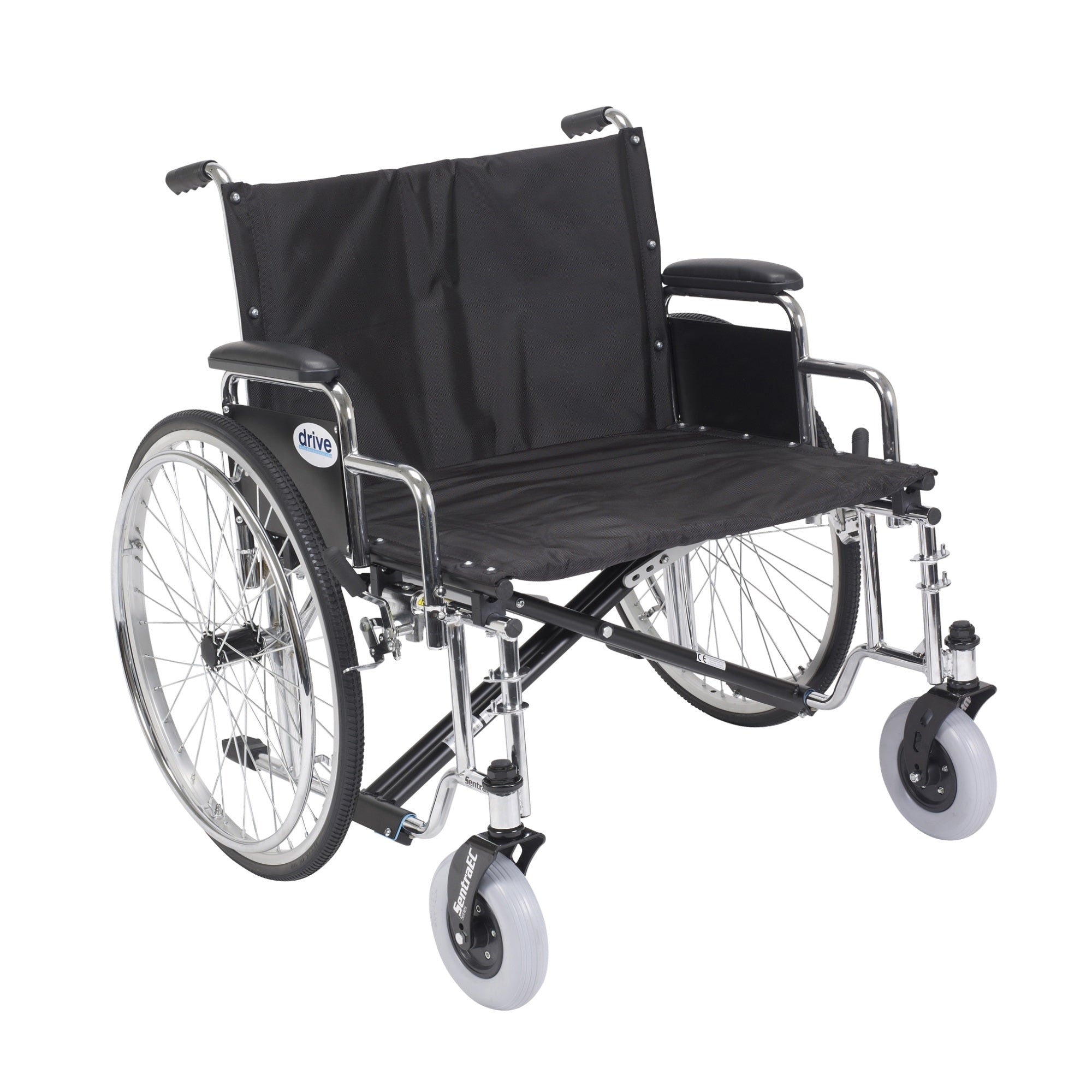 The Sentra Ec Extra Wide Heavy Duty Wheelchair From Drive Medical Boasts A 700 Pound Weight Capacity, Made Possible Through The Use Of Reinforced Steel Gussets, Reinforced Nylon Upholstery, Reinforced Side Frame, Extra Heavy Duty Front Forks And Casters, And Dual Cross Bars. The Stylish Triple Chrome Coated Steel Frame And Steel Spoke Wheels Add A Touch Of Elegance To This Bariatric Wheelchair. This Sentra Ec Extra Wide Heavy Duty Wheelchair Comes With Detachable Desk Arms And A 26 Wide Seat. Foot Rests Are Sold Separately (Elevating Leg Rests - Drive Model # Phelr, Swing Away Foot Rests - Drive Model # Ph-Sf).