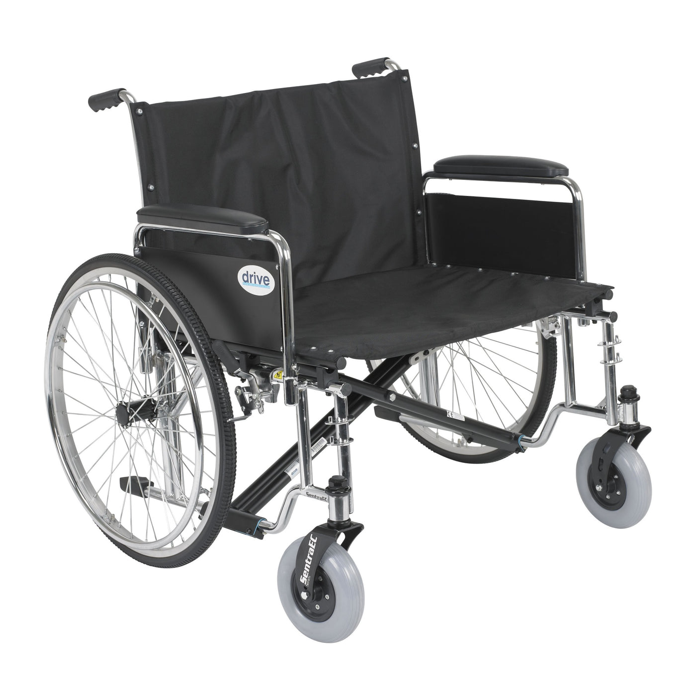 The Sentra Ec Extra Wide Heavy Duty Wheelchair From Drive Medical Boasts A 700 Pound Weight Capacity, Made Possible Through The Use Of Reinforced Steel Gussets, Reinforced Nylon Upholstery, Reinforced Side Frame, Extra Heavy Duty Front Forks And Casters, And Dual Cross Bars. The Stylish Triple Chrome Coated Steel Frame And Steel Spoke Wheels Add A Touch Of Elegance To This Bariatric Wheelchair. This Sentra Ec Extra Wide Heavy Duty Wheelchair Comes With Detachable Full Arms And A 28 Wide Seat. Foot Rests Are Sold Separately (Elevating Leg Rests - Drive Model # Phelr, Swing Away Foot Rests - Drive Model # Ph-Sf).