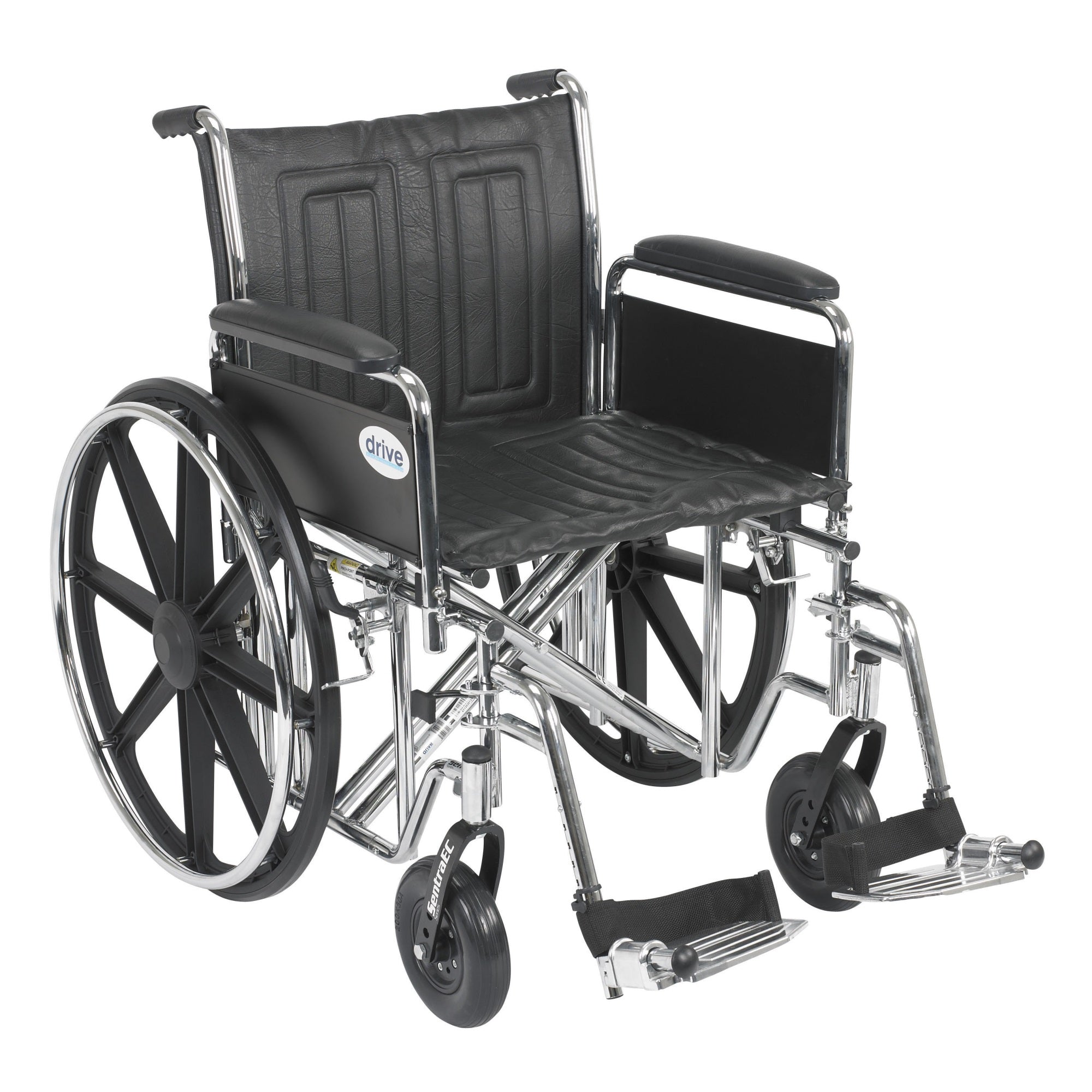 The Bariatric Sentra Ec Heavy Duty Wheelchair With Detachable Full Arms And Swing Away Footrests By Drive Medical Comes With A Dual Cross Bar That Reinforces The Carbon Steel Frame, Making This Chair Capable Of A 450 Lbs. Weight Capacity. The Carbon Steel Frame Has An Attractive, Chip Proof, Maintainable, Triple Coated, Chrome Finish And Double Embossed, Vinyl Upholstery, Making This Bariatric Wheelchair Durable, Lightweight, Attractive And Easy To Clean. The Standard, Dual Axle, Conveniently Provides An Easy Transition Of Seat To Hemi-Level. Comes Standard With Detachable Full Arms, Swing Away Footrests, 8 Front Caster Wheels, Urethane Tires, Aluminum Footplates, Chrome Hand Rims, And Push To Lock Wheel Locks, Ensuring User Safety. 3 Year Warranty.