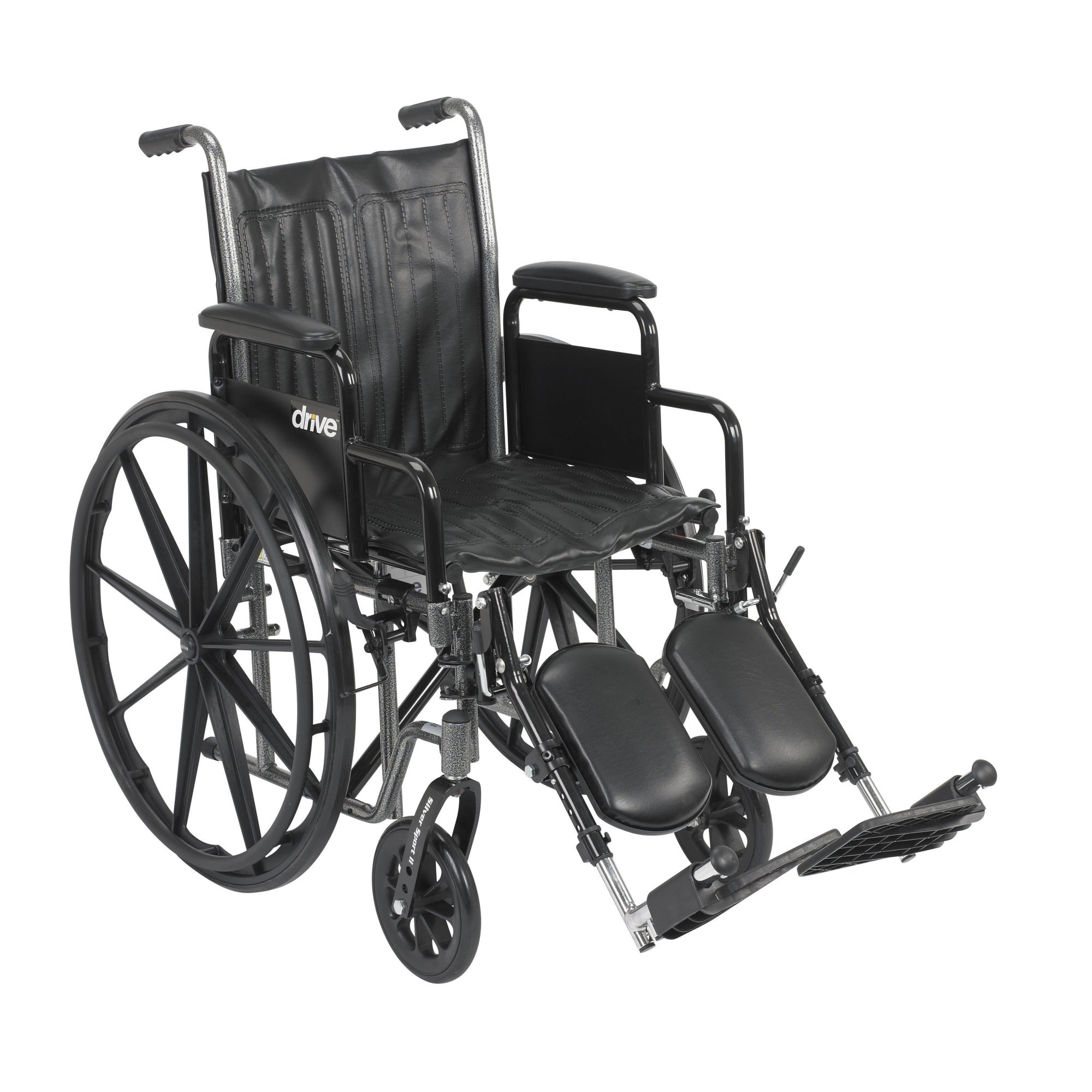 The 18 Silver Sport 2 Wheelchair With Detachable Desk Arms And Swing Away Footrests By Drive Medical Comes In An Attractive, Easy To Maintain, Powder Coated, Silver Vein Finish, And A Steel Frame For Durability. The Urethane Tires Are Mounted On Composite Wheels To Provide Durability And A Smooth Ride Over Most Surfaces. The Embossed, Nylon Upholstery Is Durable, Lightweight, Attractive And Easy To Clean. The Carry Pocket On The Backrest Provides An Easy And Safe Way To Transport Personal Items. Comes Standard With Swing Away, Elevating Footrests, Padded Detachable Desk Arms, Push To Lock Brakes And Plastic Footplates.