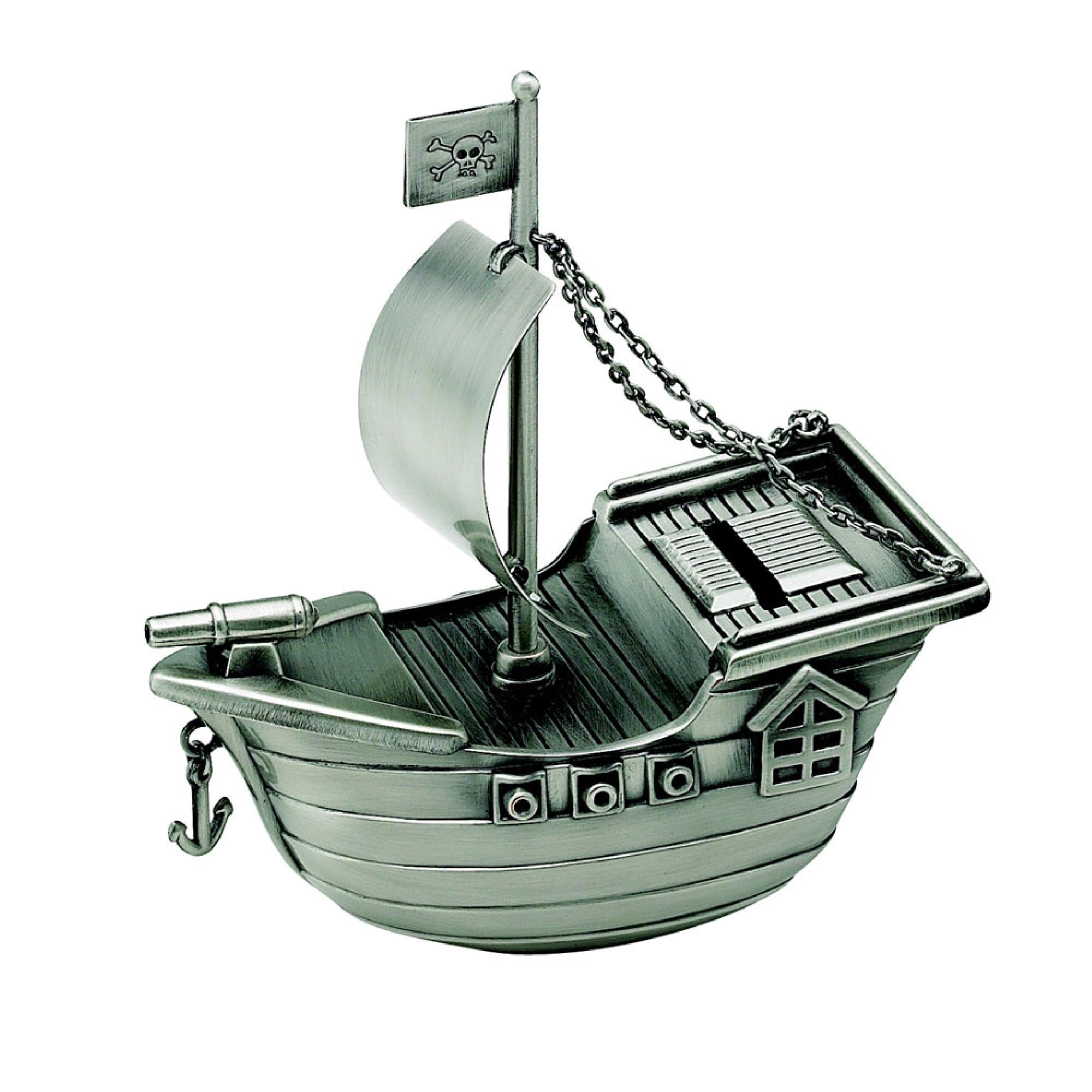 203-47105234589 Pirate Ship Bank, Pewter Finish 6' X 5.5' X 2.5', Pirates Of All Ages Will Appreciate The Realistic Detail On This Handsome Bank, Right Down To The Ships Anchor And Skull-And-Crossbones Flag. It Has A Non-Tarnish Brushed Pewter Finish. The Sail Provides The Perfect Engraving Area And It Can Be Lifted Off Of The Ship'S Hull To Help Make Engraving Easier. Overall Measurements Are 6'H X 5.5'W X 2.5D. Light Green Gift Box. Manufactured By Creative Gifts Intl, Inc, Made In Usa