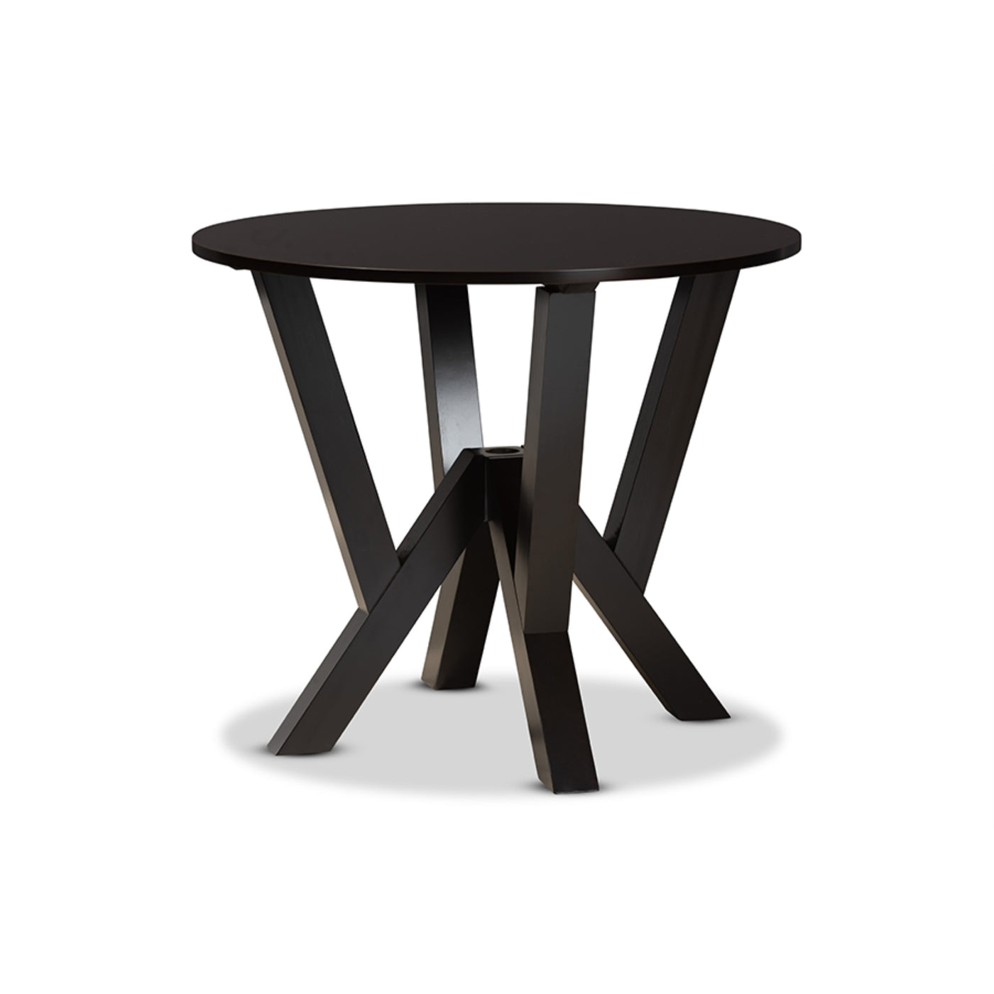 Enjoy Everyday Meals And Host Friendly Gatherings With The Riona 5-Piece Dining Set. Made In Malaysia, This Set Includes Four Dining Chairs And One Table Constructed From Wood Displaying A Rich Espresso Brown Finish. Each Chair Features A Plush Foam Padded Seat Upholstered In Soft Fabric Along With A Geometric Cut-Out Design On Their Backs For A Striking Blend Of Comfort And Style. Requiring Assembly, The Wide, Circular Tabletop Of The Riona Ensures Ample Elbow Room For Each Member Of The Table. Perfect For Enjoying Nights With Friends And Family, The Riona Dining Set Elevates Any Dining Experience.