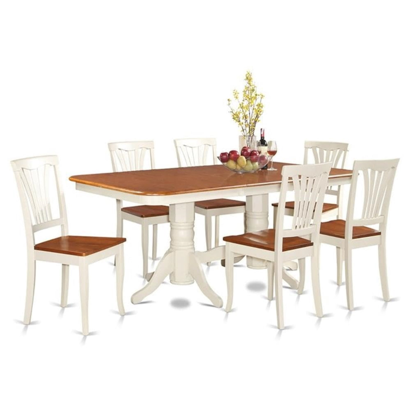 Naav7-Whi-W Naav7-Whi-W 7 Pc Dining Room Set-Dining Table With Leaf And 6 Dining Chairs, Small Kitchen Table Comes With Typical Design, Round Corners, And Double Pedestal Design. Small Dining Table Set Are Produced Out Of Asian Hardwood Offering 18 Inch Butterfly Leaf Finished In A Vibrant Buttermilk & Cherry To Match Up With Any Sort Of Dining Area. Kitchen Table Set Offers Considerable Seating And Room For Gatherings And Every Day Dinners. Finely Built Ladder Back Kitchen Dining Chairs In Solid Wood Seat Which Are Pleasant And Stylish For Daily Use And Special Parties. Dinette Table Set Incorporate A Simple Extendable Leaf, Featuring Flexibility As Well As Useful Extension To Allow For More Friends And Family.