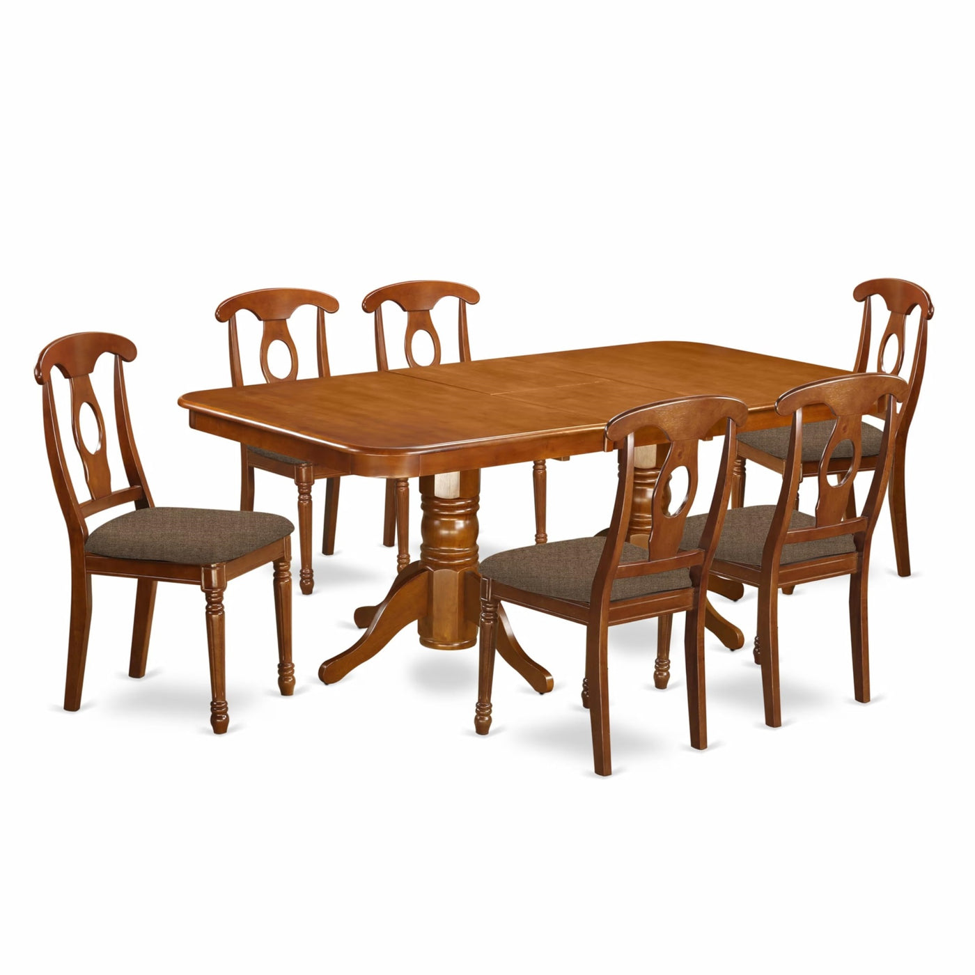 Nana7-Sbr-C Nana7-Sbr-C 7 Pc Dining Room Set For 6-Rectangular Table With Leaf And 6 Chairs For Dining, Napoleon Dining Room Table Set Deliver Amazing Asian Wood Finished In Shiny Saddle Brown Color. This Amazing Table Set Is Available To Buy With Wood Or Cushion To Suit Personal Taste And Ideal Design. Kitchen Dining Chairs Present An S Curve For Back High Level Of Comfort With A Subtle Circular Inset. Dinette Chair Are Elegantly Built Using Cylindrical-Lathed Front Legs For A Classical Look. Small Kitchen Table Have Sleek, Round Corners To Match All Classy Dining Room. Dining Room Table Contains A Double Pedestal Having An Easy Extendable Leaf.
