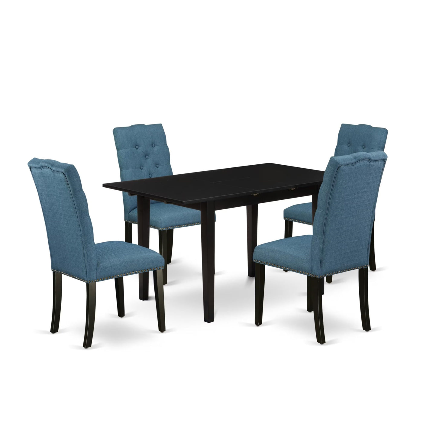 Casafoyer Noel5-Blk-21 5 Piece Dining Table Set Includes A Rectangle Dining Room Table With Leaf And 4 Blue Linen Fabric Upholstered Chairs, 32X54 Inch, Black