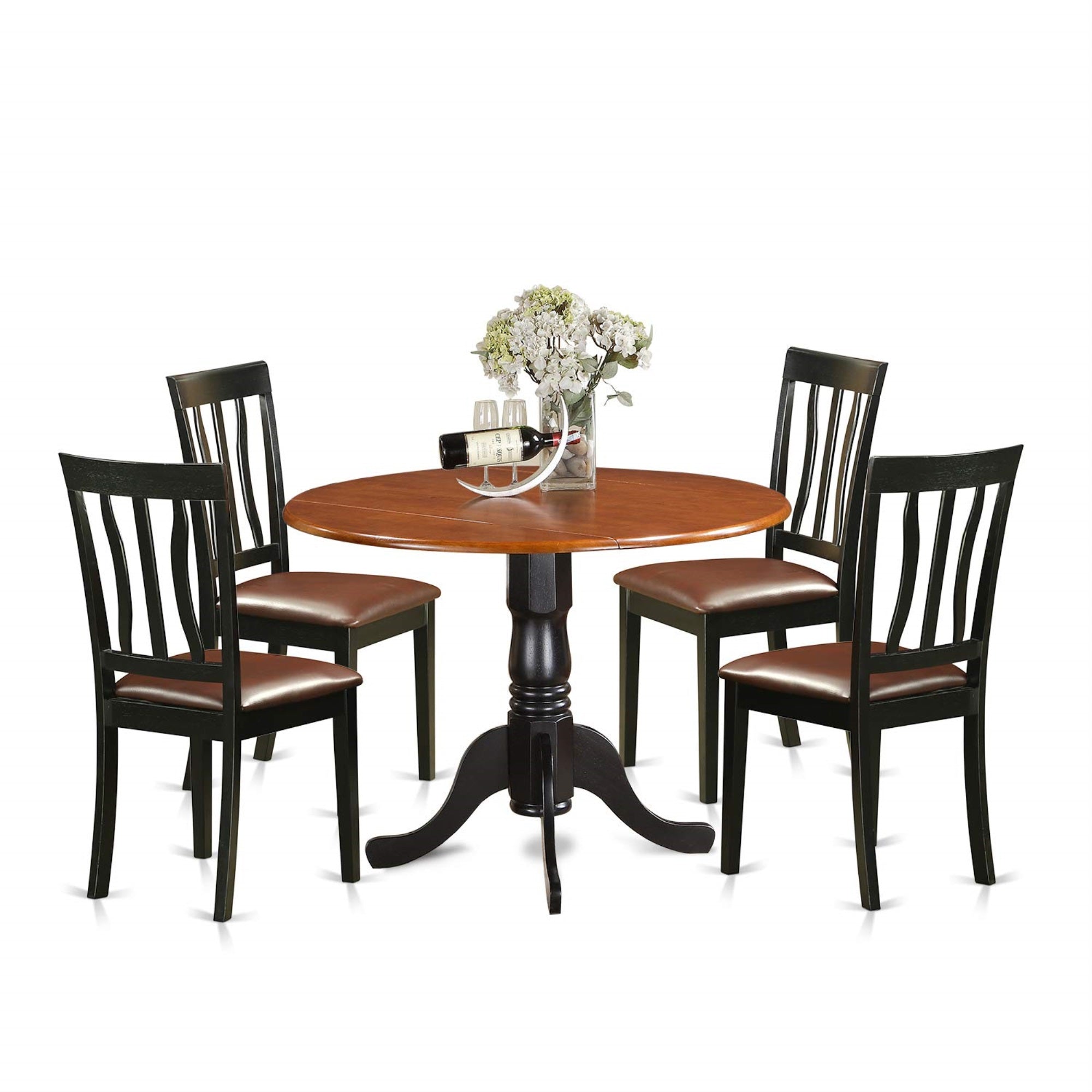 Ergode Dlan5-Bch-Lc, 5 Piece Dining Set, Round Table With Dropleaf, 4 Faux Leather Chairs, 42X42 Inch, Black & Cherry