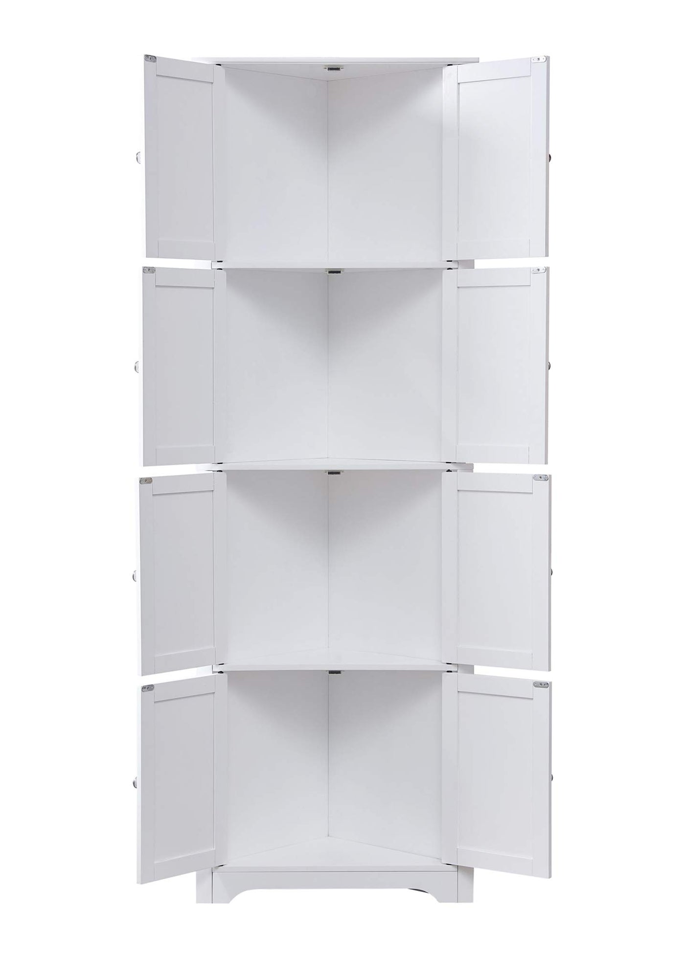 Burnham 4 Tier Contemporary Corner Kitchen Pantry Storage Cabinet, White Wood. Create A Functional And Stylish Statement In Any Room Where A Little Extra Storage Is Needed With This Tall Burnham Corner Kitchen Pantry Cabinet. With Four Interior Shelves Perfect For Dishes, Packaged Foods, Or Cookbooks, This Burnham Corner Pantry Cabinet Is Perfect For Storage Without The Clutter. Crafted From Manufactured Wood In A Neutral Hue With A Reinforced Backboard, It Also Includes Wall Mounts For Enhanced Stability.