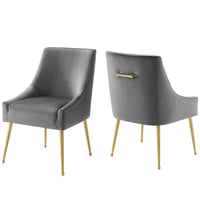 Gently Sloping Arms Cascade Down From The Flowing Design Of The Discern Performance Velvet Dining Chair Set Of 2. Solidly Constructed From Wood And Plywood, Discern Comes With Dense Foam Padding Upholstered In Stain-Resistant Performance Velvet. Complete With Splayed Brushed Gold Stainless Steel Legs And Matching Decorative Handle On The Back Of The Chair, Discern Is A Soft And Durable Addition To The Dining Room, Kitchen Entryway, Living Room, Bedroom, Home Office, Or Vanity. Create A Cozy Seating Experience With These Versatile Dining Accent Chairs Complete With Non-Marking Foot Caps.Set Includes:Two - Discern Dining Chair