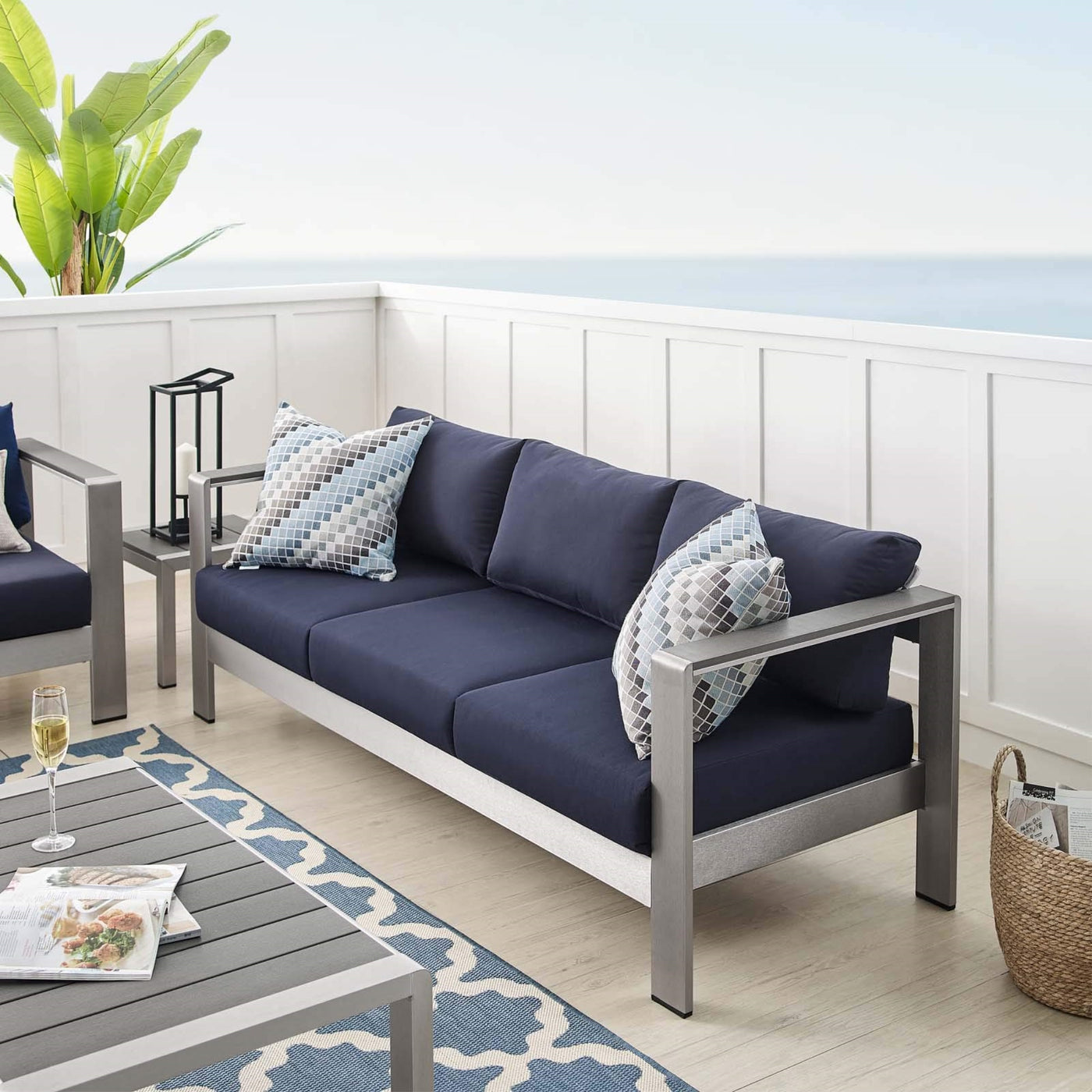 Enjoy Your Patio Or Backyard Leisure Time With The Strong And Durable Shore Outdoor Aluminum Sofa. Made With An Anodized Brushed Aluminum Frame And Non-Marking Black Plastic Foot Caps, Shore Comes Outfitted With Resilient Sunbrella Fabric Canvas Cushions Tested To Last Through All Weather Conditions. The Shore Outdoor Aluminum Sofa Complements Your Casual Gatherings With A Look And Functionality You Can Rely On.Set Includes:One - Shore Sunbrella Fabric Aluminum Sofa