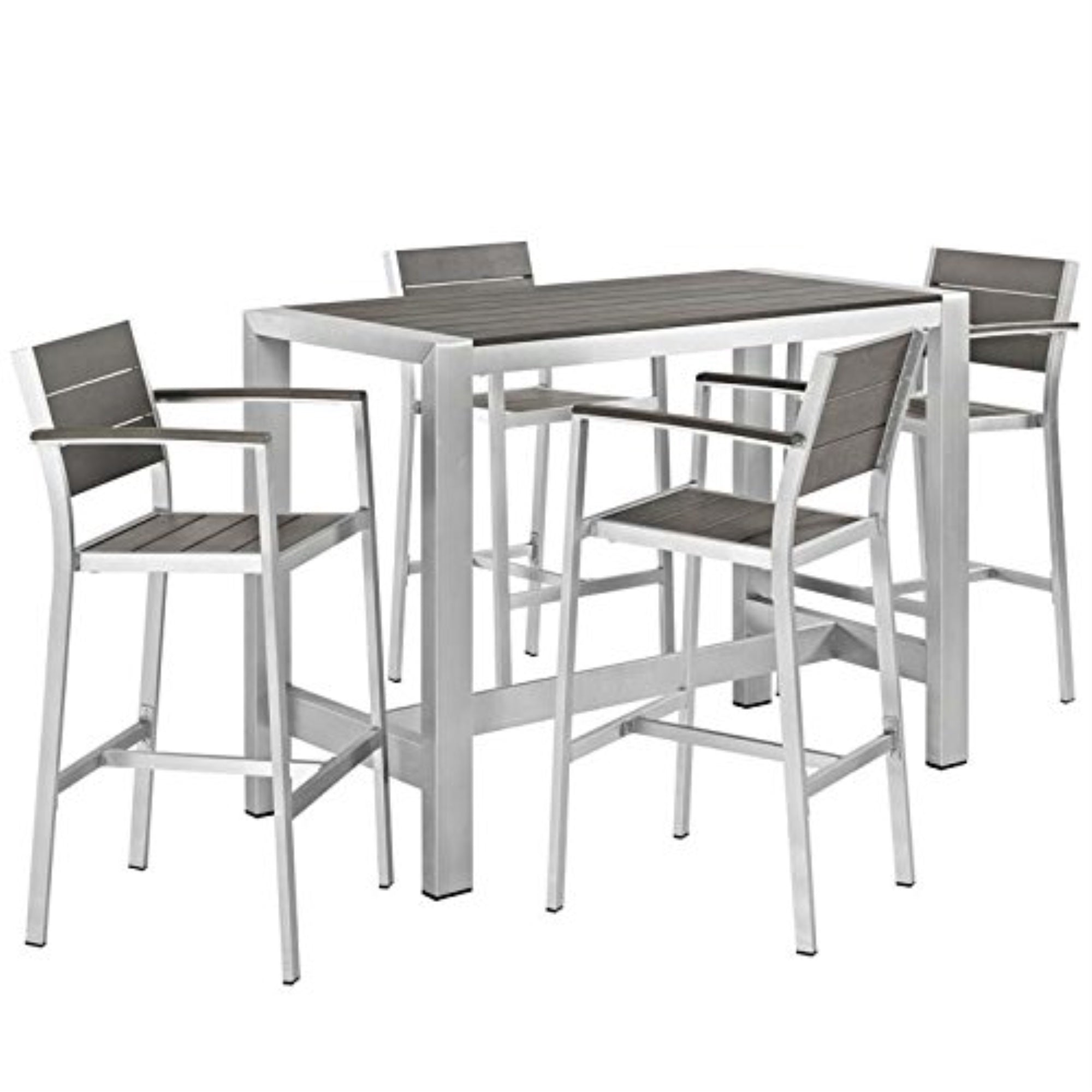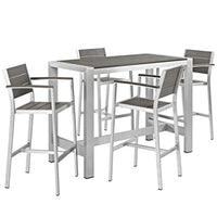 Enjoy Your Patio Or Backyard Leisure Time With The Strong And Durable Shore Outdoor Aluminum Dining Set. Made With An Anodized Brushed Aluminum Frame, Sturdy Footrest, And Non-Marking Black Plastic Foot Caps, Shore Features Tone-On-Tone Grays With Wood Accents On The Paneling For A Chic And Minimalist Look. The Shore Outdoor Aluminum Dining Set Complements Your Casual Gatherings With A Look And Functionality That You Can Rely On.Set Includes:Four - Shore Bar Stoolone - Shore Bar Table