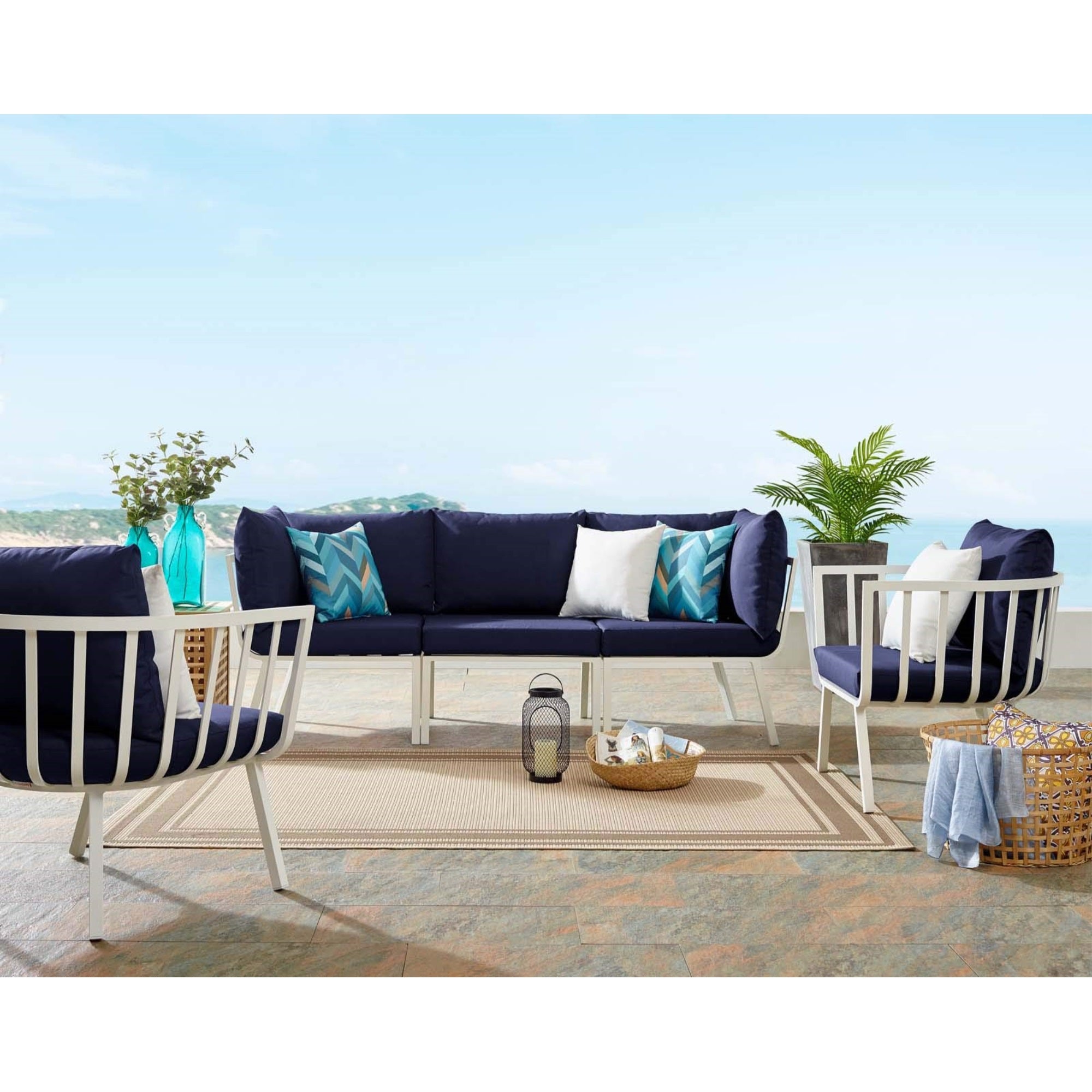 Refresh Your Outdoor Decor With The Riverside Outdoor Patio Aluminum Sofa Set. This Set Includes The Riverside Outdoor Patio Armchair. Defined By A Crisp, Coastal Style, This Installment Of The Riverside Outdoor Sectional Sofa Furniture Collection Features An Open Slatted Back Design, Angled Back Legs, And Plush 4' Thick All-Weather Uv-Resistant Fabric Cushions. Solidly Constructed With A Powder-Coated Aluminum Frame, The Riverside Outdoor Sofa And Armchair Will Enhance The Look Of Your Patio, Backyard, Balcony, Porch, Deck, Or Poolside Area. Includes Foot Caps. Seat Weight Capacity: 300 Lbsset Includes:One - Riverside Armchairone - Riverside Armless Chairtwo - Riverside Corner Chair