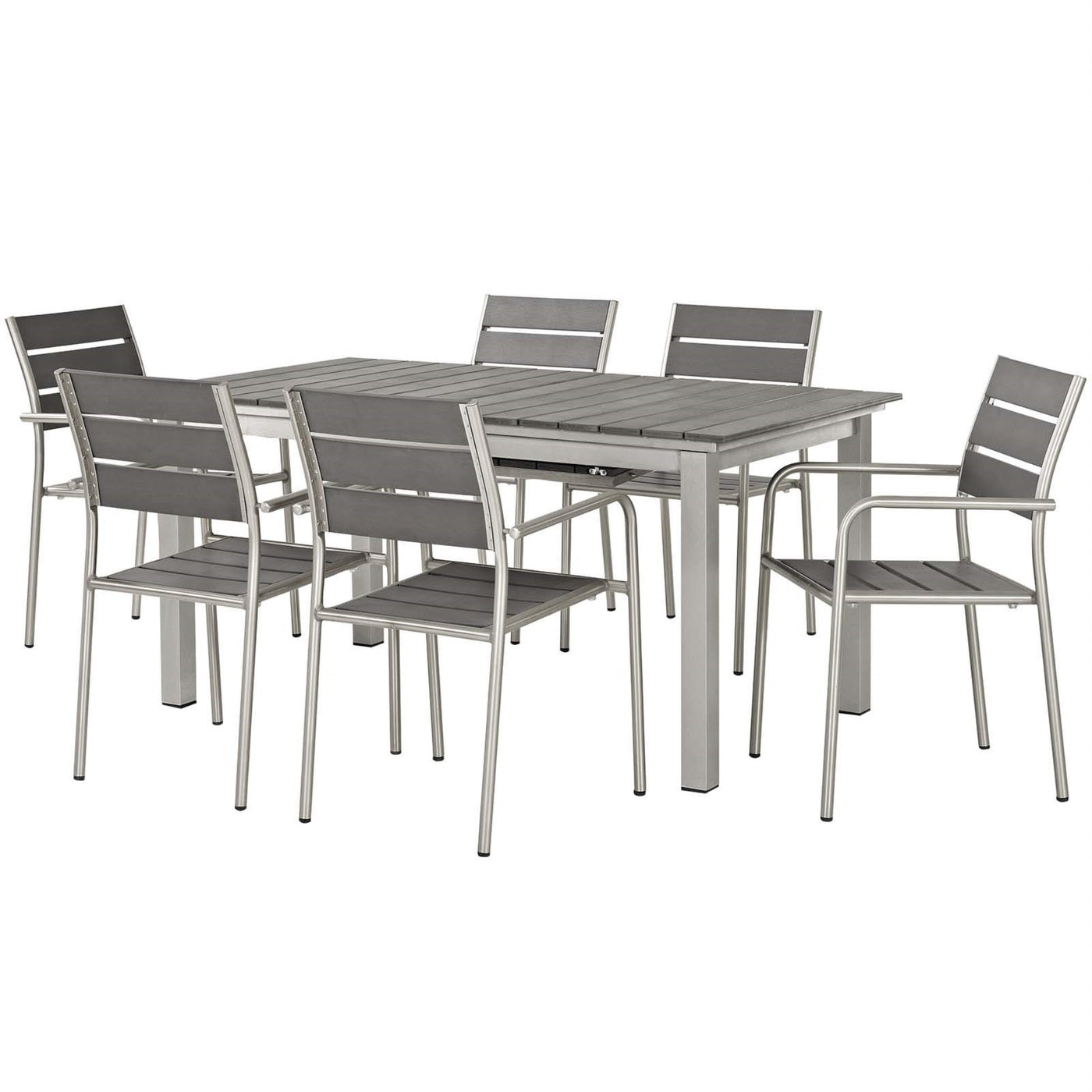 Enjoy Your Patio Or Backyard Leisure Time With The Strong And Durable Shore Outdoor Aluminum Set. Made With An Anodized Brushed Aluminum Frame, Sturdy Footrest, And Non-Marking Black Plastic Foot Caps, Shore Features Tone-On-Tone Grays With Wood Accents On The Paneling For A Chic And Minimalist Look. The Shore Outdoor Aluminum Dining Set Complements Your Casual Gatherings With A Look And Functionality That You Can Rely On.Set Includes:One - Shore Extension Tablesix - Shore Armchair