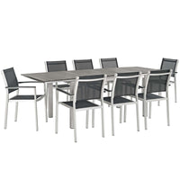 Enjoy Your Patio Or Backyard Leisure Time With The Strong And Durable Shore Outdoor Aluminum Set. Made With An Anodized Brushed Aluminum Frame, Sturdy Footrest, And Non-Marking Black Plastic Foot Caps, Shore Features Tone-On-Tone Grays With Wood Accents On The Paneling For A Chic And Minimalist Look. The Shore Outdoor Aluminum Dining Set Complements Your Casual Gatherings With A Look And Functionality That You Can Rely On.Set Includes:Eight - Shore Armchairone - Shore Extension Table