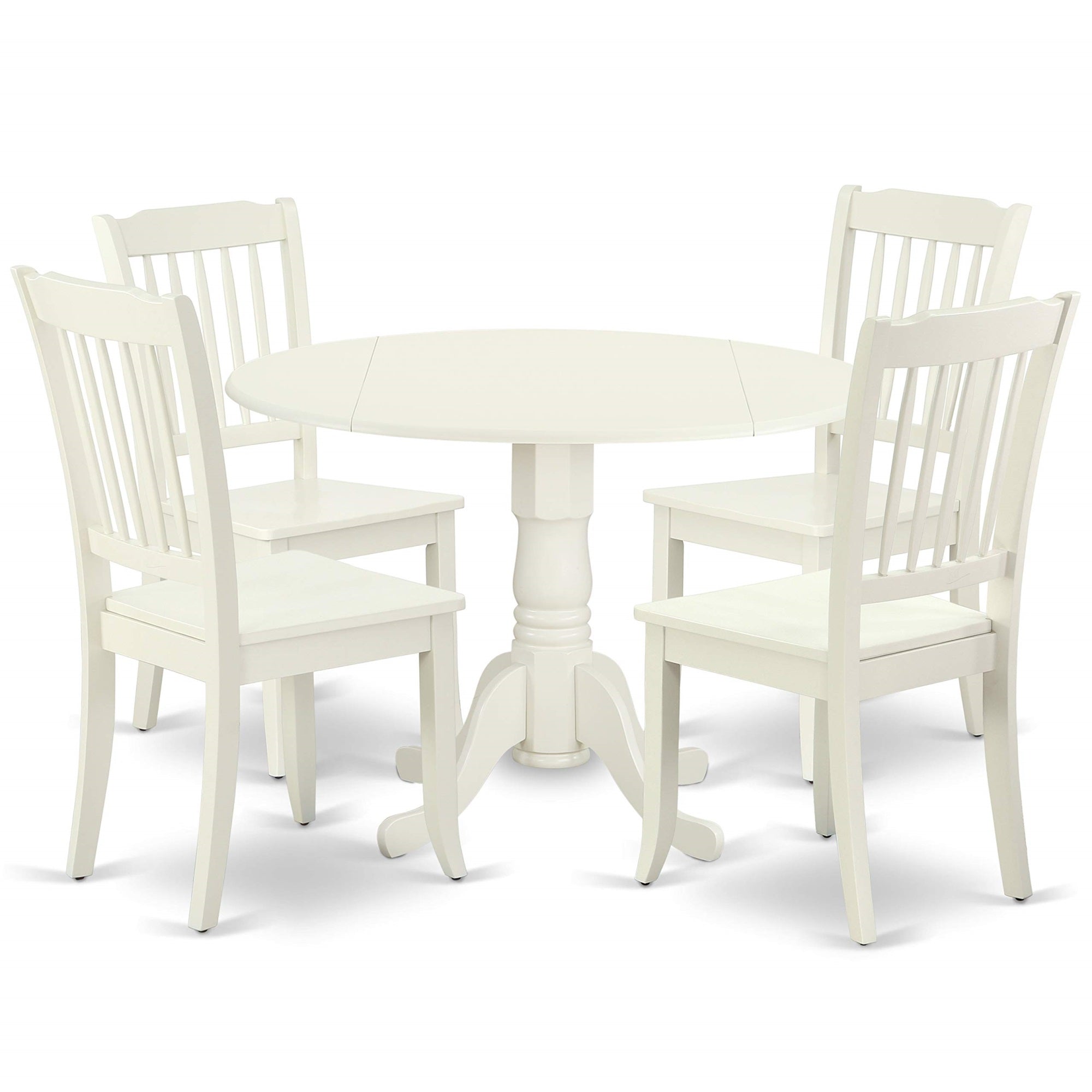 Ergode Dlda5-Lwh-W 5-Piece Kitchen Table Set, Round Table With Dropleaf, 4 Dining Chairs, Linen White, Sturdy Asian Hardwood, Compact Size, 42X42 Inch