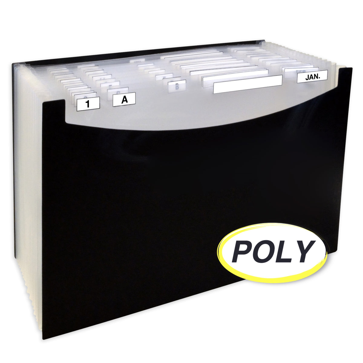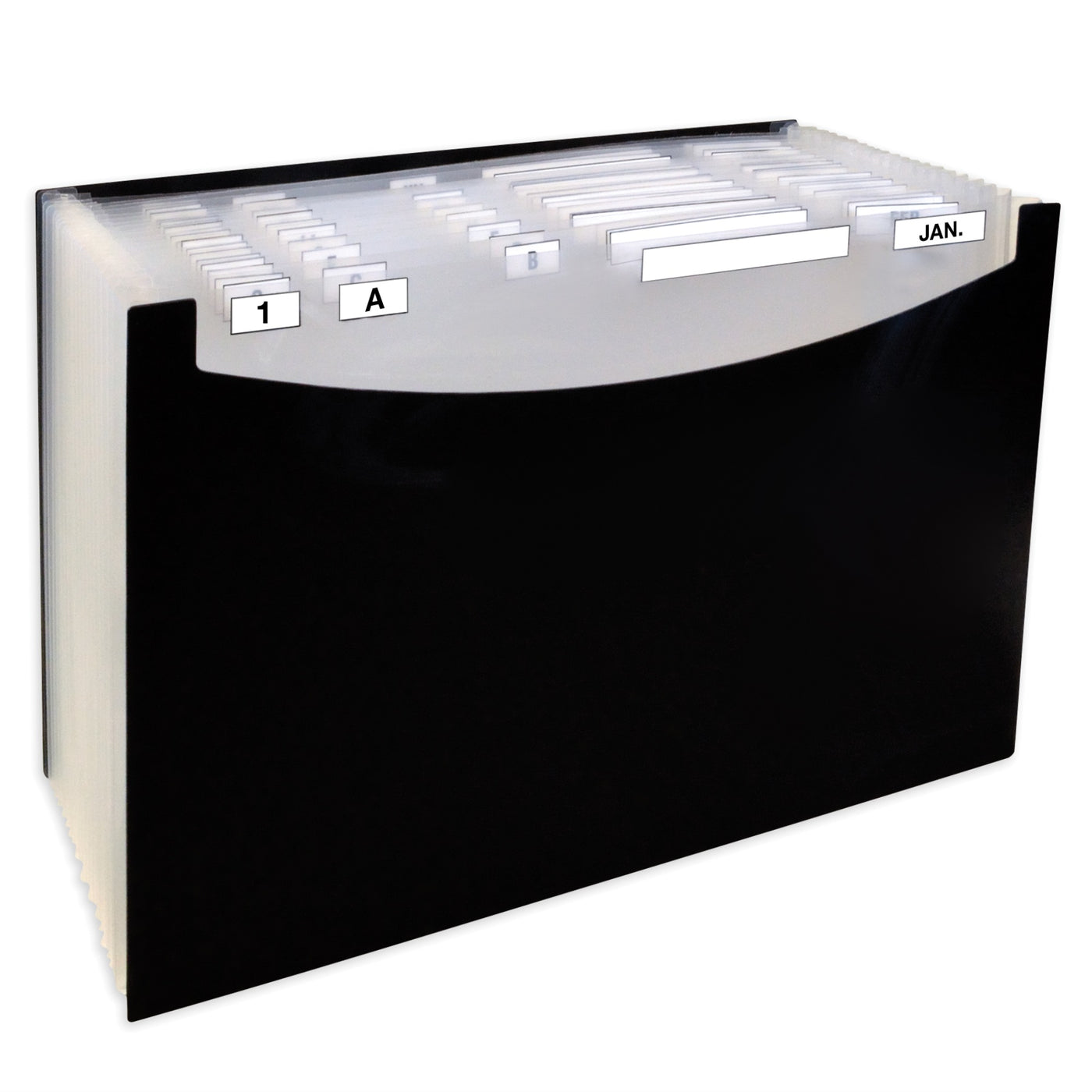 Get Your Desktop Organized With This Stand-Up, Legal Size Expanding File. 21-Pocket Expanding File Keeps Documents Organized. Open Top, Stand-Up Design Provides Easy Access. Gusseted Pockets Expand To Hold Important Letters And Documents. Dividers Feature Preprinted Labels With A-Z, 1-31, January-December, 1St-4Th Quarter And Write-In Areas To Add Custom Labels. Made From Acid-Free Polypropylene. Expands Up To 12 Inches To Hold Up To 1,000 Sheets Of Paper. For Legal Size Document Storage. Black.