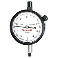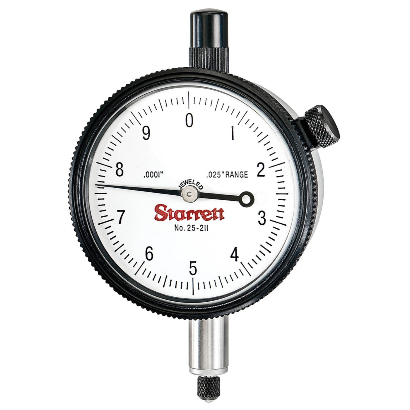 The Starrett 25 Series Dial Indicator Has A Shockless, Hardened Steel Gear Train And Jewel Bearings, Except Where Noted. It Is Furnished With A Lug-On-Center Back. Antimagnetic Mechanism Is Optional For All Models. Special Non-Shock Mechanism Is For All Models Except 25-109, 25-209 And 25-116. .025 Range, Dial Reading 0-10, .0001 Grad.