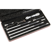 The Starrett 823 Tubular Inside Micrometer Set Features .001' Graduation, With 7 Rods, 4-24' Range, And 1' Movement Of Screw. 4-24 Range With 7 Rods, With Case.