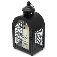 Psalm 46:10.' Exquisite Arch Shape Black Metal Lantern Features Lacy Open Filigree Sides, Along With Large Glass Window In Back And On The Front Door.