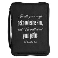 This Black Fabric Bible Cover Has A Sturdy 600 Denier Canvas Look Polyester With Nylon Reinforced Stitching. Non-Rusting And Self-Repairing Side Zipper. Carrying Handle At Side. Cover Lays Completely Flat When Open; Inside Is A Loop For Your Pen And An Attached Ribbon Bookmark. The Large Print Size Holds A Bible Or Book Up To About 7 3/4 X 2 1/2 X 11 1/4. White Screenprinted Scripture Reads: In All Your Ways Acknowledge Him, And He Shall Direct Your Paths, Proverbs 3:6.
