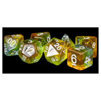Yellow Aurora Polyhedral Dice Set With White Numbers.