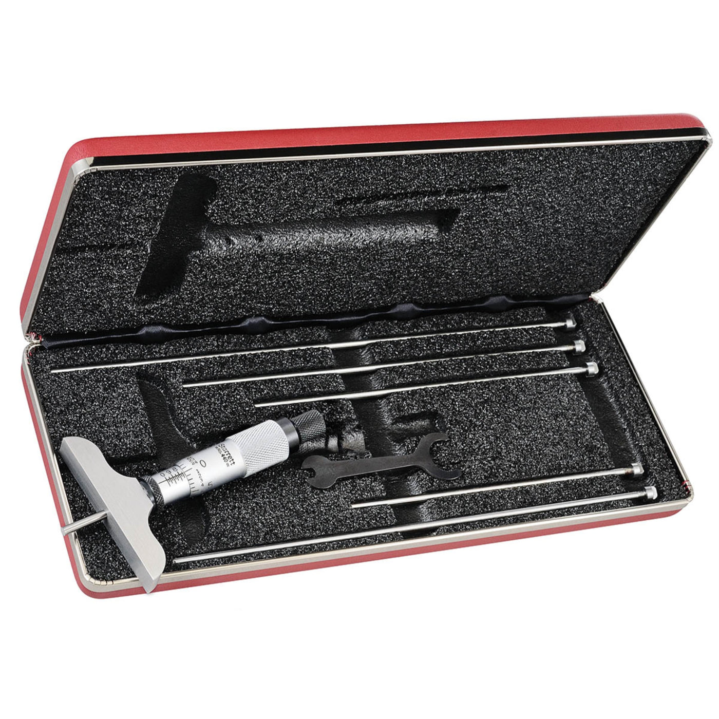 The Starrett 440, 440M, 445, 445M Series Depth Micrometer Features A Combination Ratchet And Speeder, Ring-Type Locknut, Ratchet Stop And Locknut. 0-6 Range, 2 1/2 Base, 6 Rods, Lock Nut, Case.