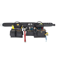 A Premium Quality 5-Piece Carpenters Combo Tool Belt In Ballistic Poly Fabric With A 5 In. Padded, Double-Tongue Roller Buckle Belt And 18 Pockets With Ample Room For Your Favorite Nails And Tools. 18 Pockets, Sleeves And Holders Provide Ample Storage For Nails And Tools Totally Versatile - All Parts Removable And Interchangeable Easy Carry Handle Design Provides Simple Adjustments, Easy Carrying And Storage Of Apron Without Spilling Contents Rugged, Lightweight Ballistic Poly Fabric Sta-Open Feature On Main Reversed Pockets 5 In. Wide Padded Comfort Belt With Double Tongue Steel Roller Buckle Fits Waist Sizes 29 In To 46 In