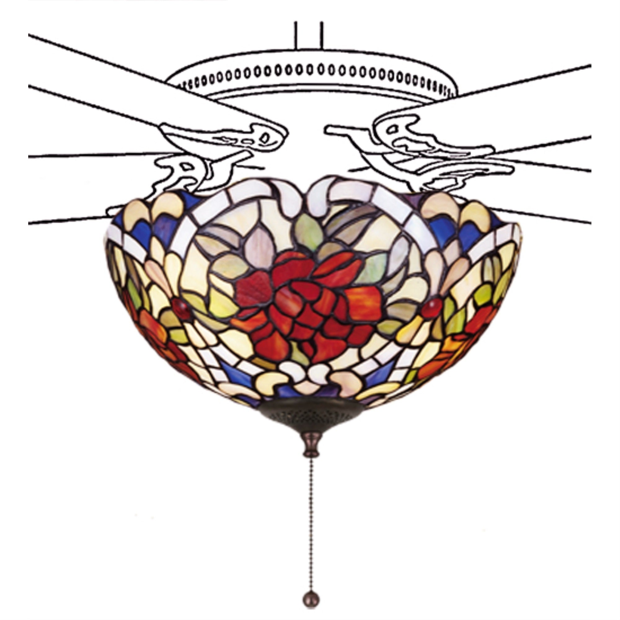 27458 12'W Renaissance Rose Fan Light Fixture Manufacturer By Meyda. A Single Cabernet Red Rose; Framed In Sunset Green Leaves And Ivory Scrolls; Sits On Lavender And Plum Bronze Lace. This Beautiful Tiffany Style Stained Glass Fan Light Shade Will Add Old World Elegance To Your Home. Fan Not Included. Lens Color : Ruby;Mauve;Beige;White, Made In China