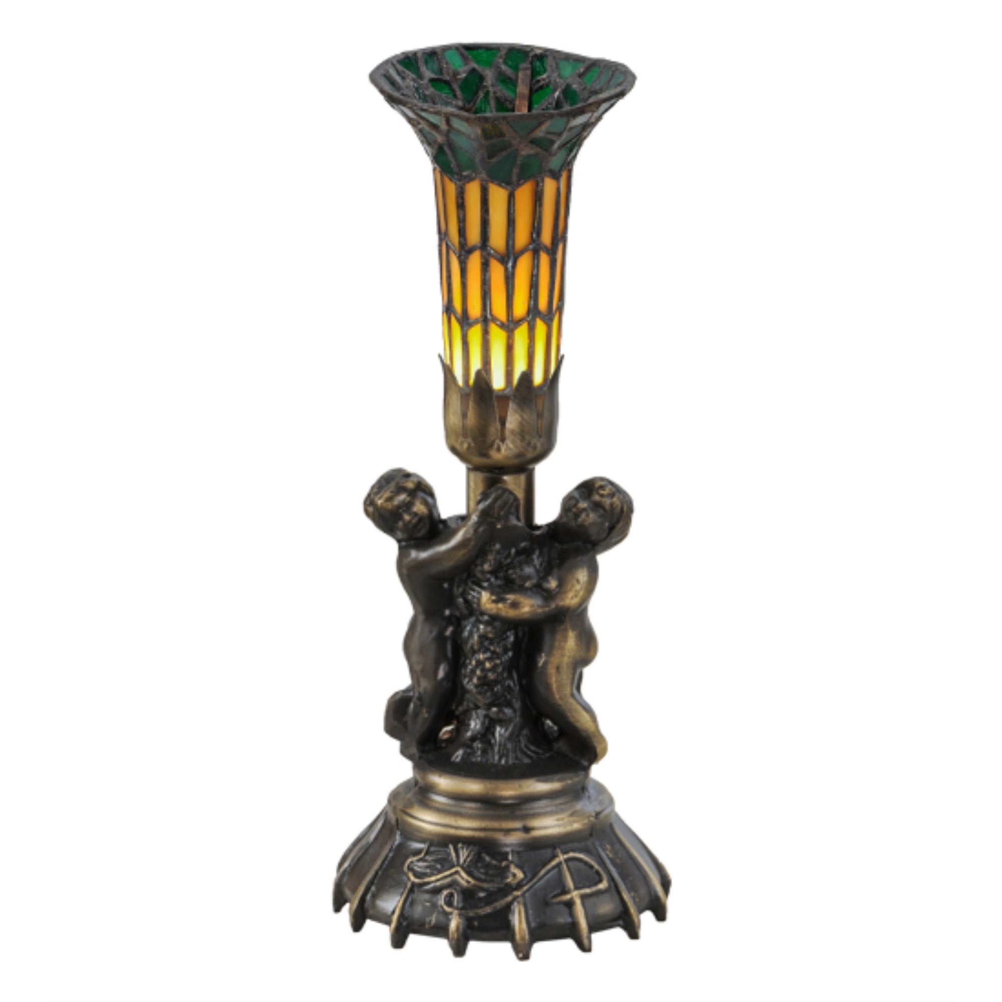 18451 13'H Twin Cherub Tiffany Pond Lily Mini Lamp Manufacturer By Meyda. Every Meyda Tiffany Item Is A Unique Handcrafted Work Of Art. Natural Variations In The Wide Array Of Materials That We Use To Create Each Meyda Product Make Every Item A Masterpiece Of Its Own. Photographs Are A General Representation Of The Product. Colors And Designs Will Vary. Lens Color : Sunflower;Green, Made In China