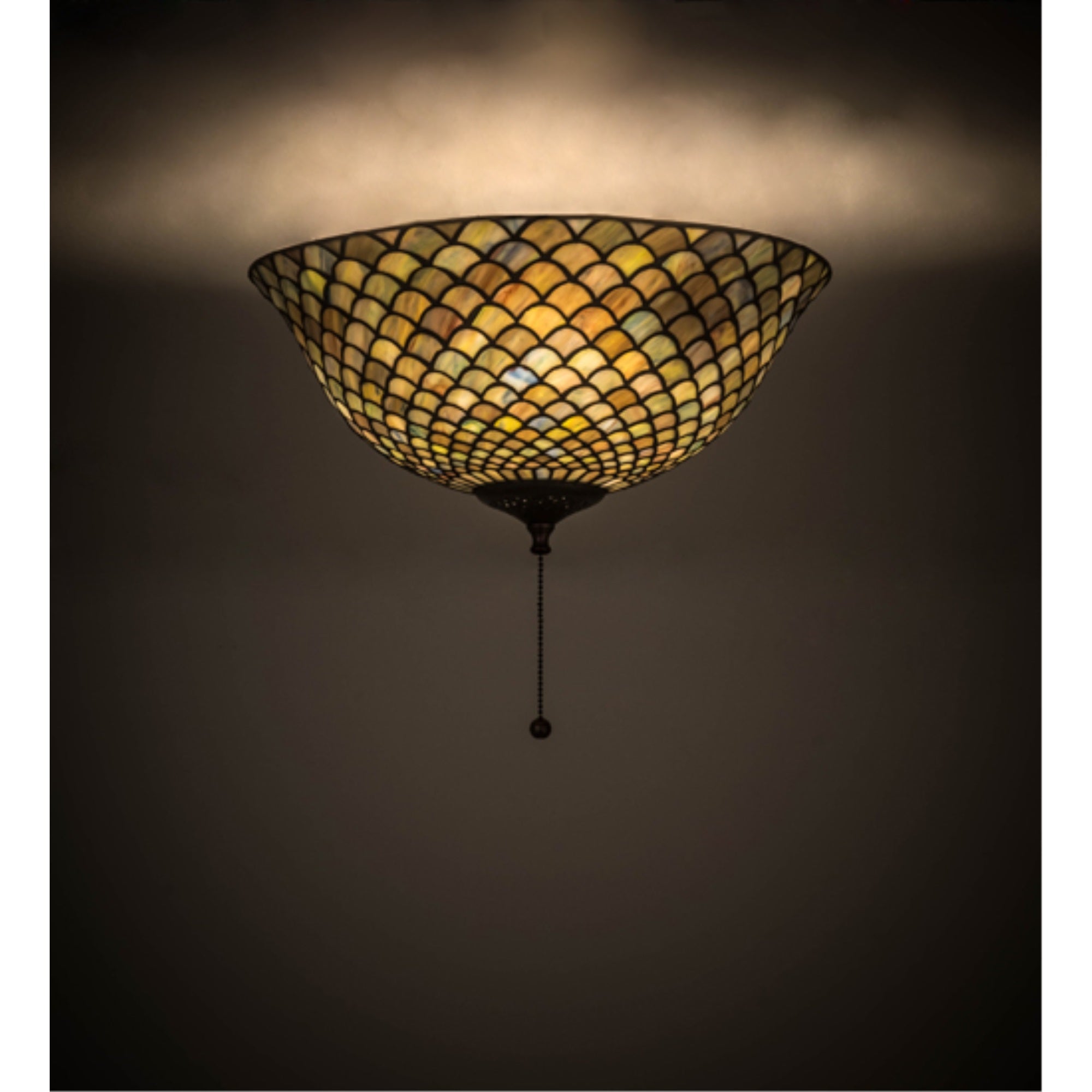 27437 16'W Tiffany Fishscale Flushmount Manufacturer By Meyda. The Louis Comfort Tiffany Studio Classic Fishscale Pattern Is Reproduced In Variegated Art Glass Of Honey Dripped Emerald; Sapphire; And Garnet Colors; Evoking A Unique Dimensional And Textured Look In A Rainbow Of Brilliant Hues. This Exquisite Glass Shade Is Enhanced With Mahogany Bronze Hand Finished Hardware And Will Complement Nearly Any Type Of Interior Decor. Custom Sizes; Styles; Finishes And Dimmable Lamping Options Available. No Two Sheets Of Stained Glass Will Precisely Match The Beautiful Works Of Art Shown. We Cannot Depict Every Color Variation But If You Are Looking For A Specific Coloration; Call Our Customer Service Staff For An Updated Image Of Our Most Current Stock Items. This Ceiling Fixture Is Ul And Cul Listed. Lens Color : Amber Glass (Not Mica);Green;Violet, Made In China