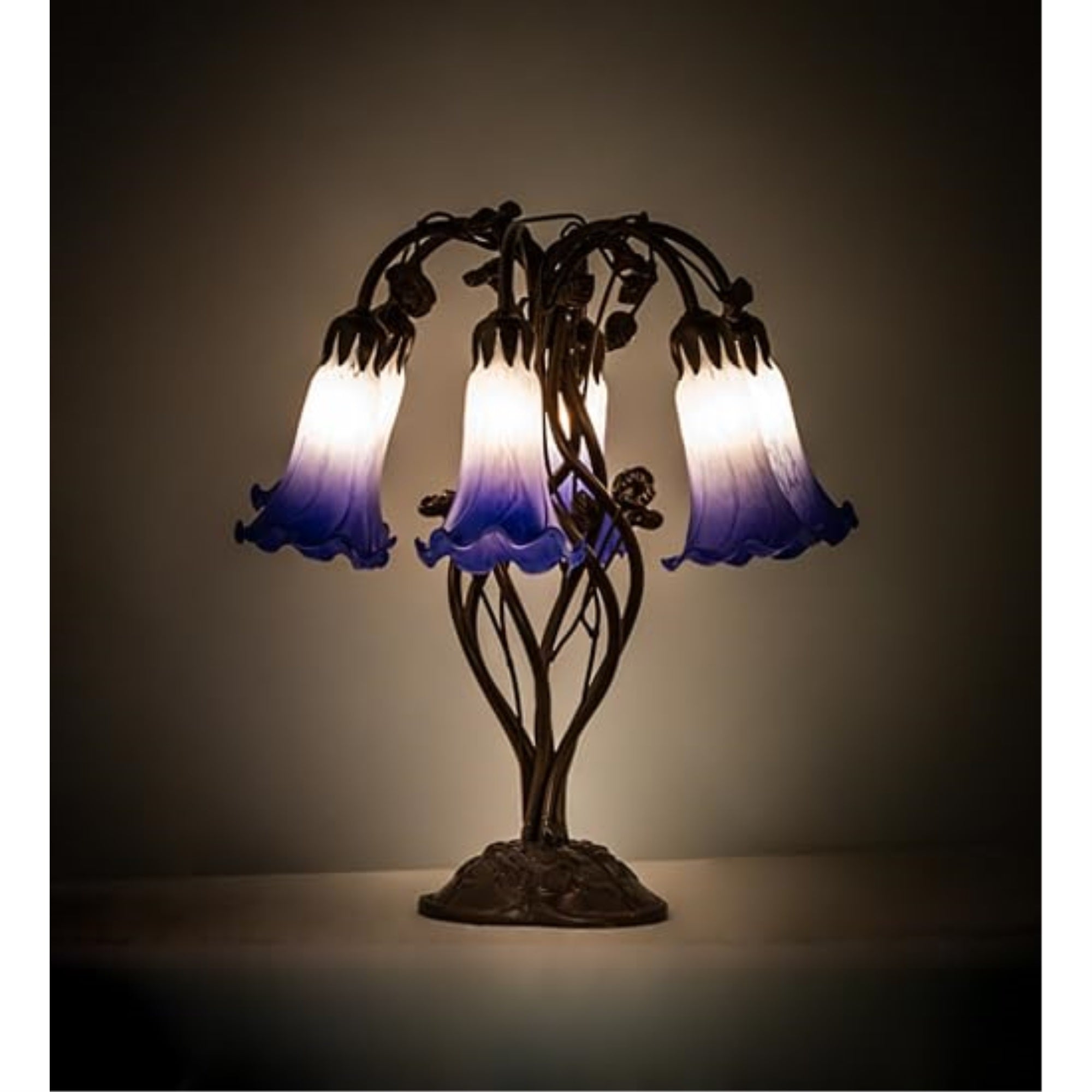 Recreating The Popular Tiffany Design From The Early 1900S... This Table Lamp Offers An Attractive; Delicate Design Featuring Six Stunning Shades That Are Created Using Mouth Blown Favrile Style Blue And White Art Glass. The Pond Lily Shades Are Embraced By An Elegant Cast Metal Base With Floral And Vine Accents That Are Finished By Hand In Mahogany Bronze. The Pond Lily Table Lamp Is Featured In Our American Designed; Handcrafted Favrile Glass Lighting Collection. Ul And Cul Listed For Dry Locations. Each Shade Is A Unique Work Of Art With Color Variations Based On Natural Ingredients Inherent In The Glass. Contact Us If Color Matching Is Critical When Ordering Multiple Items.