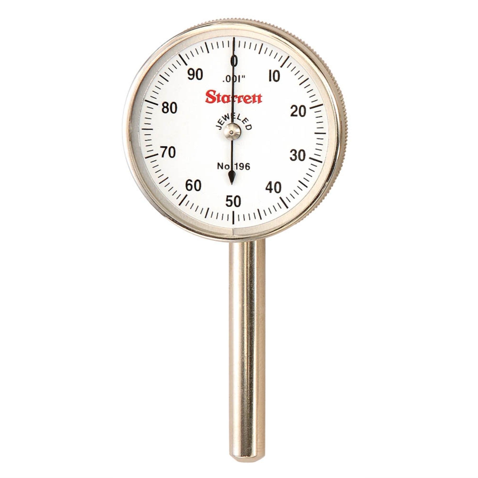 The Starrett 196 Universal Back Plunger Dial Indicator Features Graduations To .001 And 0.02Mm That Handle By Far The Majority Of Jobs. Shank Diameter Is 1/4 (6.3Mm). The Operator First Chooses The Proper Contact From The Three Hardened Contact Points That Come With Each Model. Then The Contact Should Be Brought Against The Work With Enough Pressure To Give The Hand One Full Turn. Set The Hand At Zero By Rotating The Dial With The Knurled Bezel. This Provides One Full Rotation Of The Hand Both To The Right And Left Of Zero, Showing A Rise Or Drop In The Work And The Amount Of That Variation. 0-100 With 3 Contact Points And Adapter Only This Provides One Full Rotation Of The Hand Both To The Right And Left Of Zero, Showing A Rise Or Drop In The Work And The Amount Of That Variation.