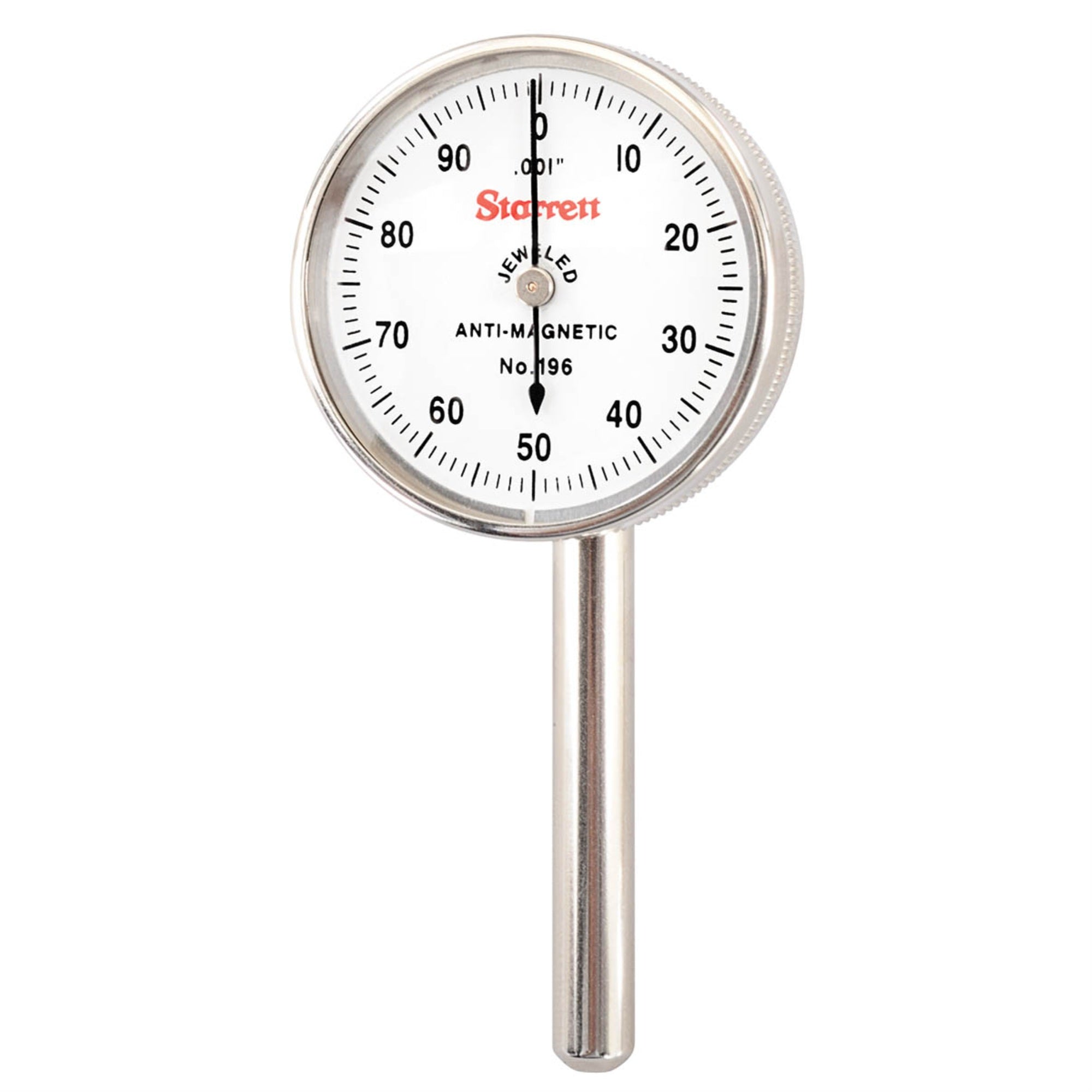 The Starrett 196 Universal Back Plunger Dial Indicator Features Graduations To .001 And 0.02Mm That Handle By Far The Majority Of Jobs. Shank Diameter Is 1/4 (6.3Mm). The Operator First Chooses The Proper Contact From The Three Hardened Contact Points That Come With Each Model. Then The Contact Should Be Brought Against The Work With Enough Pressure To Give The Hand One Full Turn. Set The Hand At Zero By Rotating The Dial With The Knurled Bezel. This Provides One Full Rotation Of The Hand Both To The Right And Left Of Zero, Showing A Rise Or Drop In The Work And The Amount Of That Variation. 0-100 Antimagnetic With 3 Contact Points Only This Provides One Full Rotation Of The Hand Both To The Right And Left Of Zero, Showing A Rise Or Drop In The Work And The Amount Of That Variation.