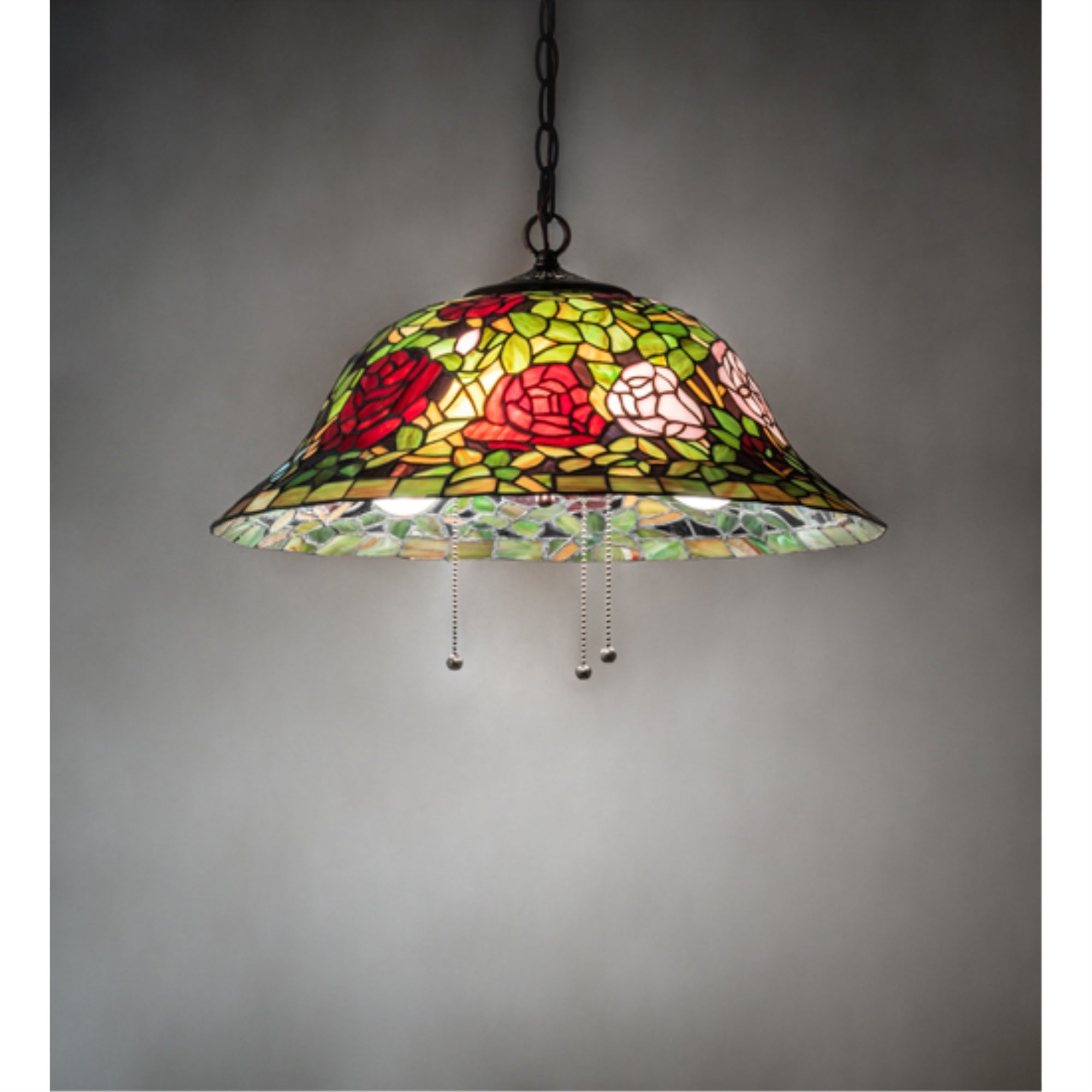 232777 20' Wide Tiffany Rosebush Pendant Manufacturer By Meyda. The Most Beloved Of All Flowers; The Rose; Is Beautifully Represented In This Meyda Reproduction Of A Tiffany Studio Classic. Petal Pink; Romantic Red And Plum Passion Art Glass Roses Ramble On A Maze Of Garden Green Leaves. This Resplendent Art Glass Shade Is Created Using The Famous Meyda Tiffany Copperfoil Construction Process. The Delicate Domed Stained Glass Shade Is Paired With Hand Finished Mahogany Bronze Hardware. Overall Height Ranges From 13 To 48 Inches As The Chain Length Can Be Easily Adjusted In The Field To Accommodate Your Specific Lighting Needs. Ul & Cul Listed For Dry And Damp Locations. Lens Color : Ruby;Pink;Green, Made In China