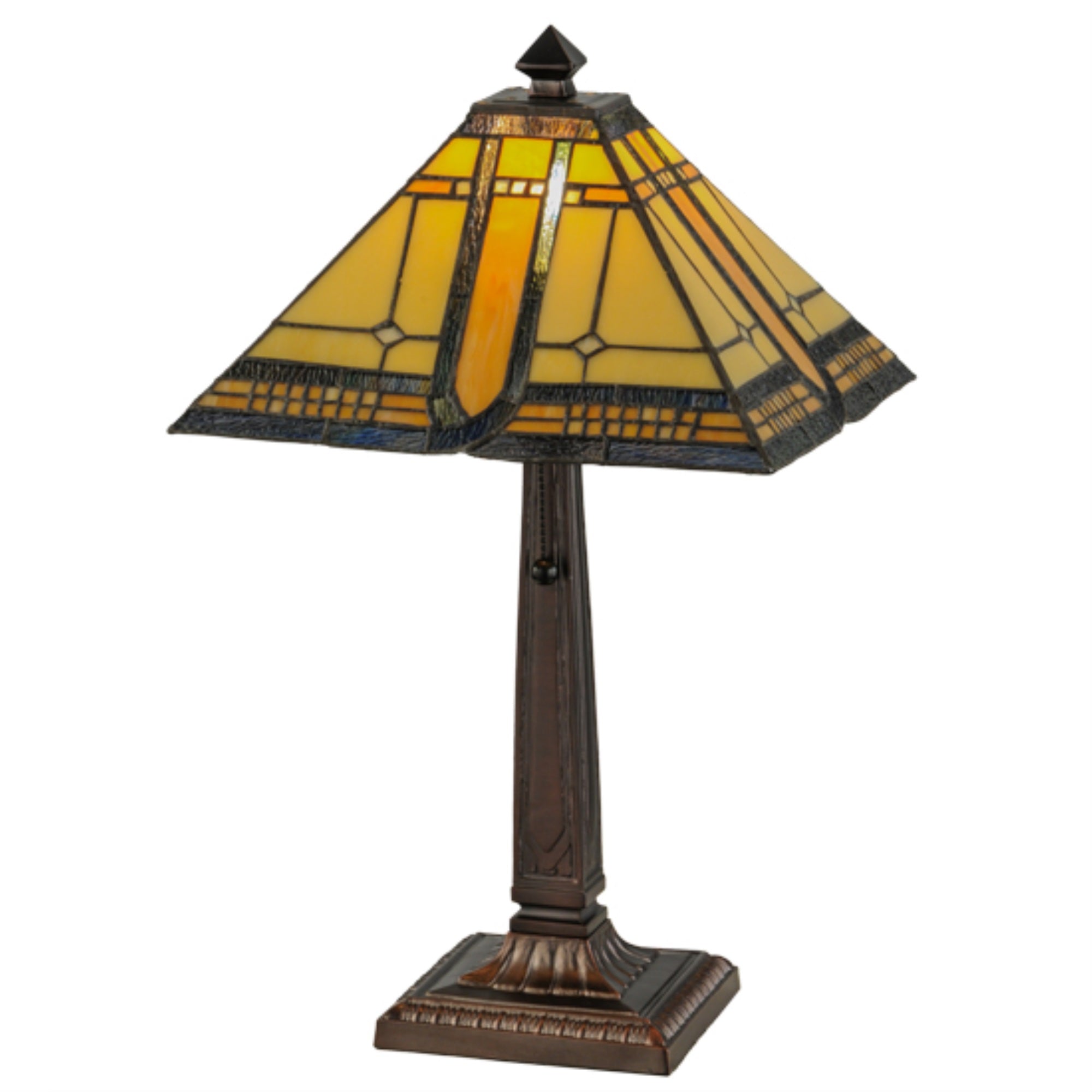 147482 21'H Sierra Prairie Mission Table Lamp Manufacturer By Meyda. A Powerful Design Statement Fueled By Strong Lines And A Simple Geometric Design; This Lamp?S Art Glass Shade Features Beige And Honey Tones Accented With Multicolored Ripple Glass. Brilliant Stained Glass; An Appealing Mission Styled Shade And An Old World Base Finished In Mahogany Bronze Are Fashioned Into A Handsome Lamp. The Art Glass Shade Is Constructed Using Meyda Tiffany'S Famous Copperfoil Construction Process. Lens Color : Sunflower;Amber Glass (Not Mica);Green;Blue;Violet;Beige, Made In China