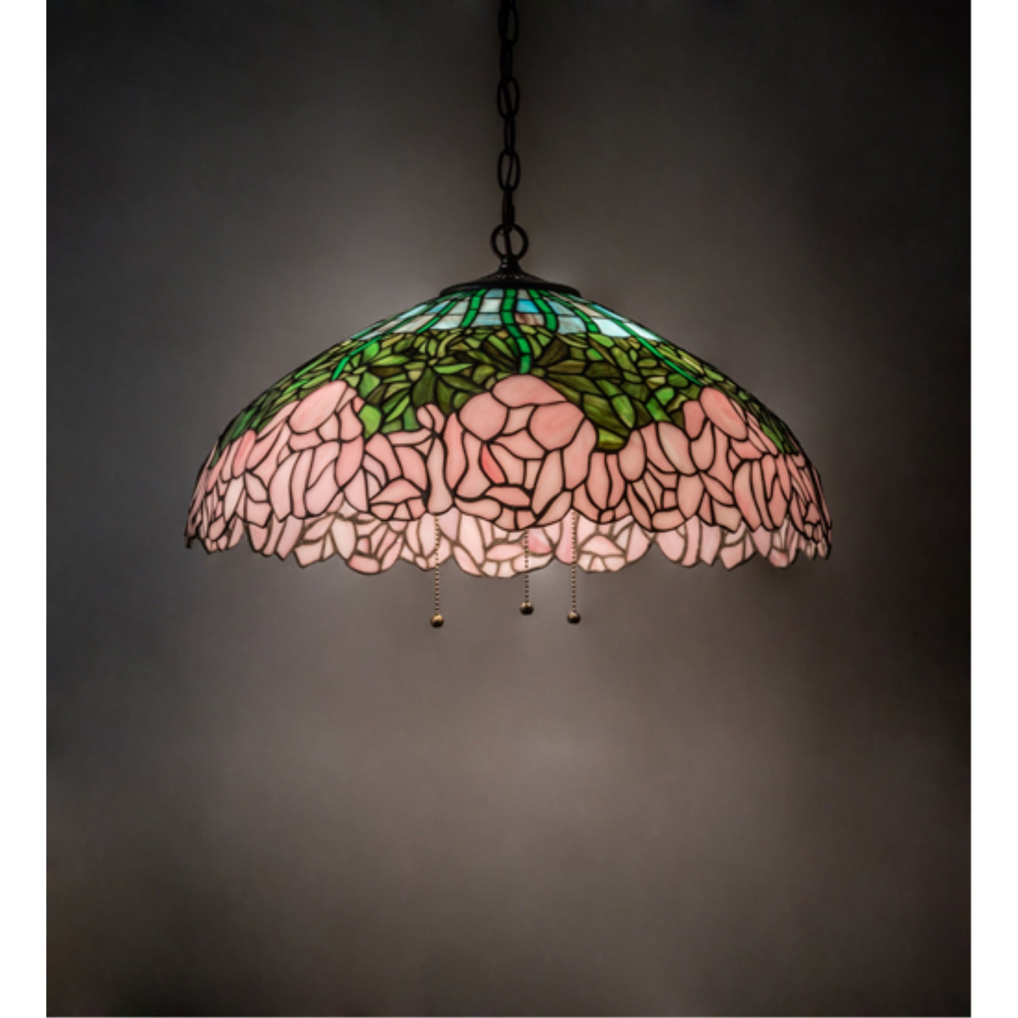 231113 22' Wide Tiffany Cabbage Rose Pendant Manufacturer By Meyda. A Wreath Of Full Blooming Passion Pink Cabbage Roses Circle This Beautiful Stained Glass Shade In A Design Inspired By The Louis Comfort Tiffany Studio. Bronzed Green Leaves And Teal Green Stems Form A Pattern Against A Blue Opal Sky. The Shade Is Created Using The Famous Meyda Tiffany Copperfoil Construction. The Shade Is Complemented With A Mahogany Bronze Finish. The Overall Height Ranges From 5 To 40 Inches As The Chain Length Can Be Easily Adjusted In The Field To Accommodate Your Specific Lighting Application Needs. Ul And Cul Listed For Dry And Damp Locations. Lens Color : Pink;Green, Made In China