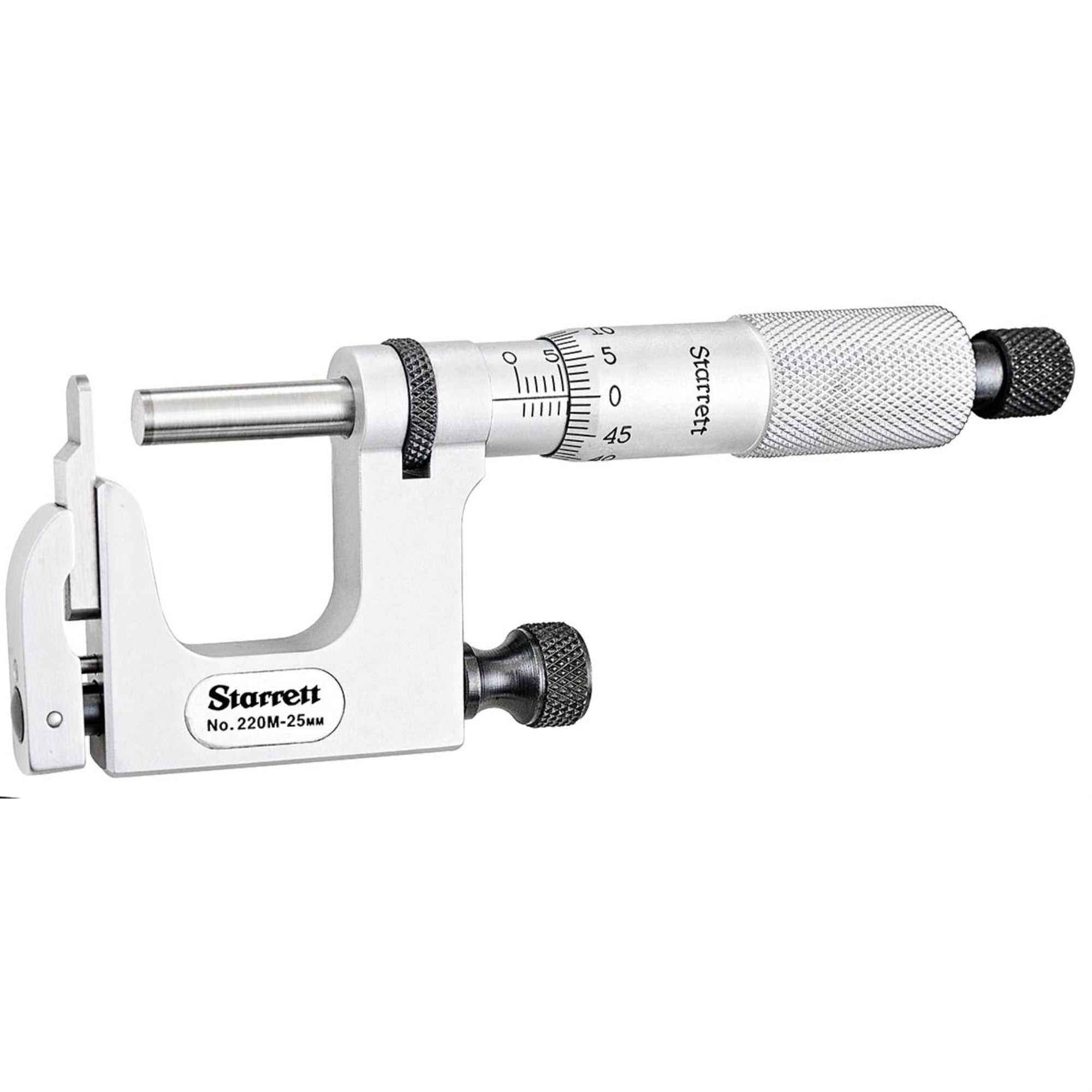 The Starrett 220 Mul-T-Anvil Micrometer With Round And Flat Anvils And Carbide Faced Spindle Is Not Backed Up By A Frame As In A Regular Micrometer And Can Bend Slightly. 25Mm, 0.01Mm Grad, Ratchet Stop, Lock Nut, Carbide Spindle.