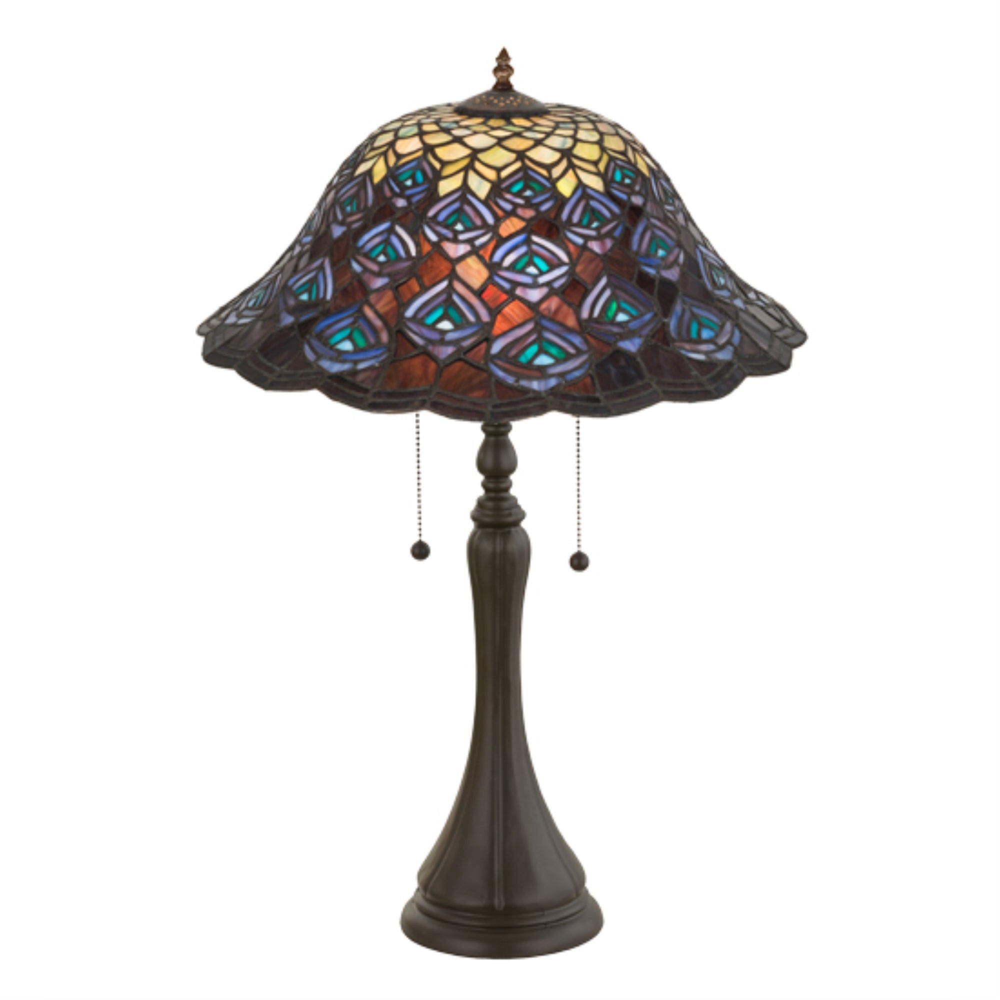 14574 22'H Tiffany Peacock Feather Table Lamp Manufacturer By Meyda. As Distinctive As A Beautiful Peacock'S Feathers; No Two Shades Will Ever Be The Same As Their Individuality Can Be As Remarkably Unique As Their Personality. This Artistic Creation Utilizes Swirling Opalescent Art Glass Background Combinations Including Beige Amber; Yellow Pinks; Red Purples; Golden Blues And Greens; Ivories; Bluish Whites; Turquoise Blues; Periwinkle; Olive And Spring Greens; Pale Yellow; Amethyst; Emerald And Topaz. The Eye Of The Plumage Design Reveals Purples; Pastel Blues; Teals; Cobalt And Ivories. Individual Pieces Of Glass Are Hand Cut And Wrapped Using Meyda Tiffany'S Famous Copperfoil Construction. Each Shade Is A Unique Work Of Art With Color Variations Based On Natural Ingredients Inherent In The Glass. Mahogany Bronze Finish. Lens Color : Amber Glass (Not Mica);Green;Blue;Violet, Made In China
