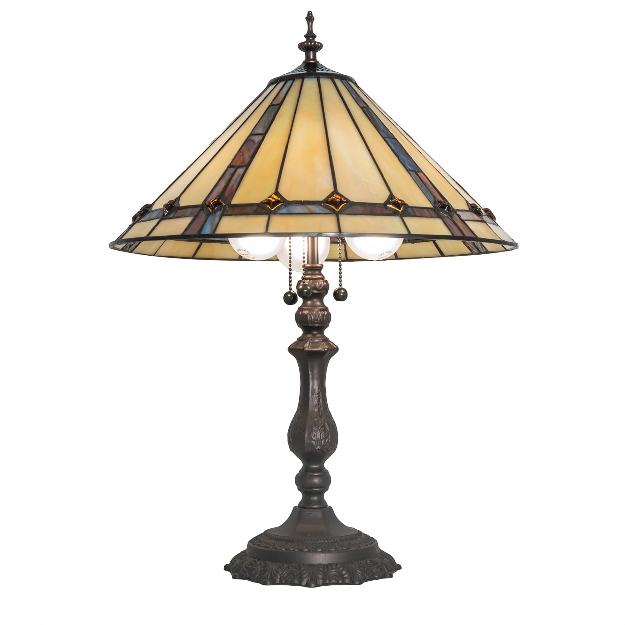 Exquisite Purple And Sunburst Colored Trim With Amber Jewels Adorns Beige Iridescent Glass On This Conical Lamp Shade. This Stunning Shade Is Constructed With The Famous Meyda Tiffany Copperfoil Construction Process And Is Enhanced With A Warm Mahogany Bronze Finish. The Belvidere Table Lamp Is Included In Our American-Designed; Handcrafted Stained Glass Lighting Collection. Ul & Cul Listed For Dry Locations. Each Shade Is A Unique Work Of Art With Color Variations Based On Natural Ingredients Inherent In The Glass. Please Feel Free To Contact Us If Color Matching Is Critical When Ordering Multiple Items.
