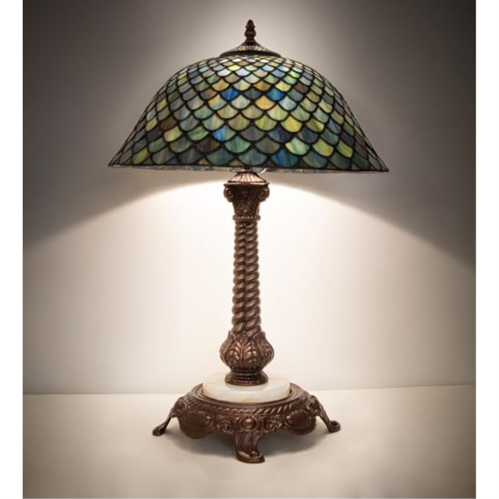 A Louis Comfort Tiffany Studio Classic Fishscale Pattern Is Reproduced In Variegated Amber Plum Art Glass. This Beautiful Stained Glass Shade Is Created With The Famous Meyda Tiffany Copperfoil Construction Process And Enhanced With A Mahogany Bronze Finished Base Featuring A White Onyx Accent. A Versatile Table Lamp To Complement Any Color Or Style. The Fishscale Table Lamp Is Featured In Our American Designed; Handcrafted Tiffany Reproduction Lighting Collection. Ul And Cul Listed For Dry Locations. Each Shade Is A Unique Work Of Art With Color Variations Based On Natural Ingredients Inherent In The Glass. Contact Us If Color Matching Is Critical When Ordering Multiple Items.