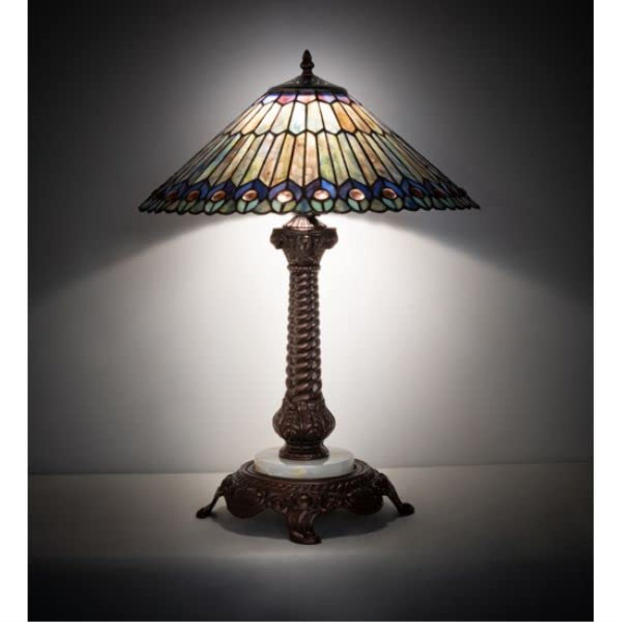 This Artistic Creation Features Beautiful Peacock Feathers On An Art Glass Background Of Soft Pastel Colors. The Eye Of The Plumage Design Reveals Purple; Blue; And Teal; Accented With Clear Glass Jewels. The Shade Is Created Using The Famous Meyda Tiffany Copperfoil Construction And Complemented With A Mahogany Bronze Finished Base With An Onyx Accent. The Tiffany Jeweled Peacock Table Lamp Is Featured In Our American Designed; Handcrafted Tiffany Stained Glass Collection. Ul And Cul Listed For Dry Locations. Each Shade Is A Unique Work Of Art With Color Variations Based On Natural Ingredients Inherent In The Glass. Contact Us If Color Matching Is Critical When Ordering Multiple Items.