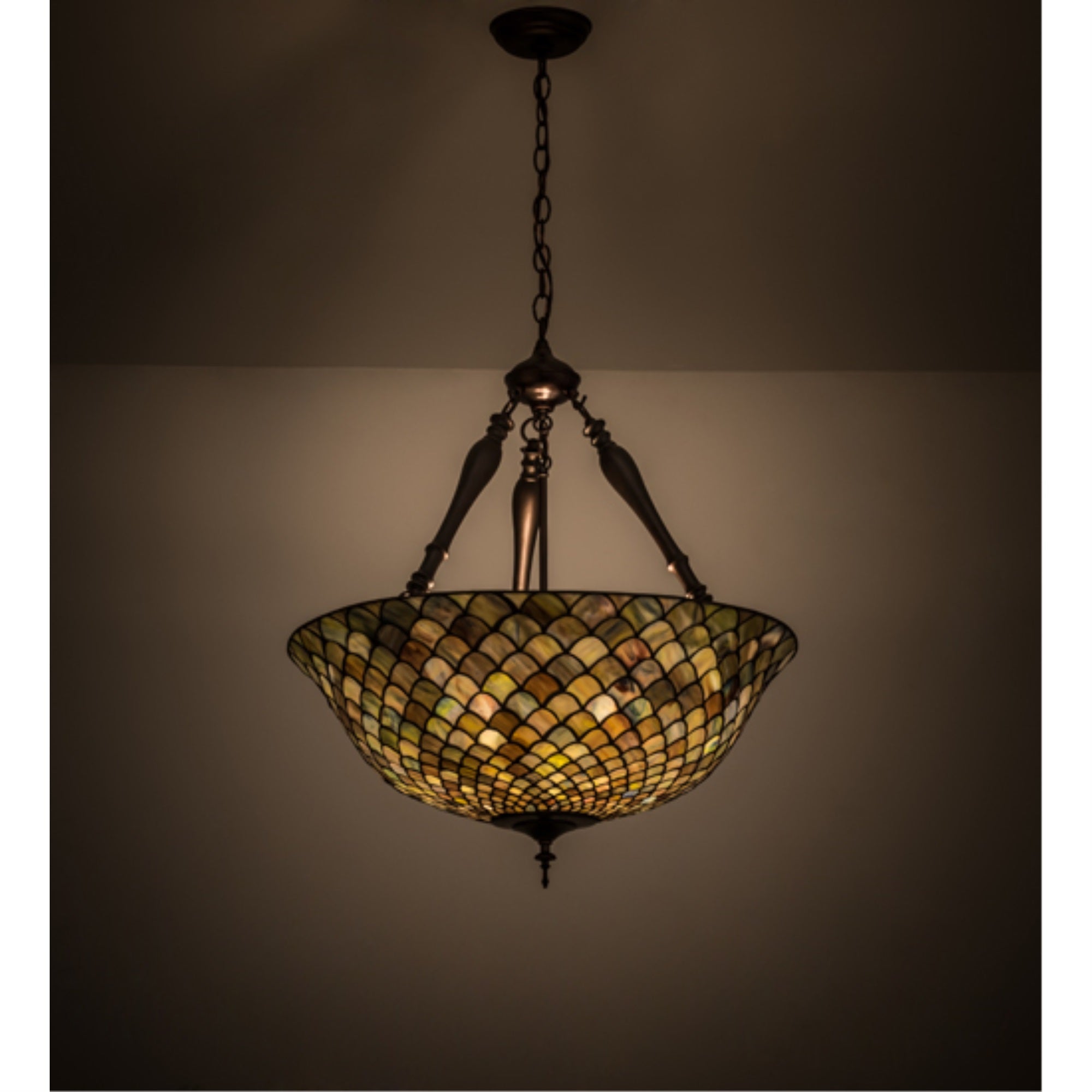 30466 24'W Fishscale Inverted Pendant Manufacturer By Meyda. A Louis Comfort Tiffany Studio Classic Fishscale Pattern Reproduced In Variegated Glass Of Honey Dripped Emerald; Sapphire; And Garnet. This Handsome Stained Glass Shade Is Used With Mahogany Bronze Hand Finished Hardware. A Versatile Inverted Pendant To Complement Any Color Or Style. Lens Color : Amber Glass (Not Mica);Green;Violet, Made In China