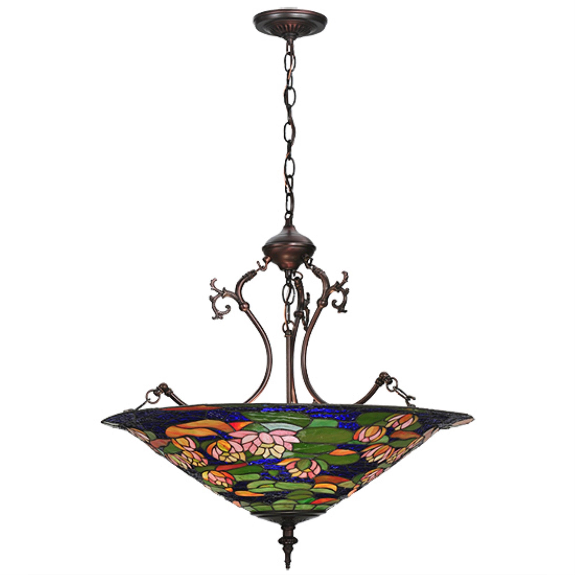 32313 24'W Tiffany Pond Lily Inverted Pendant.602 Manufacturer By Meyda. Flowering Lilies And Buds Of Ivory Kissed Petal Pink Art Glass Rest On Sun Dappled Pond Green Lily Pads In Shimmering Tranquil Blue Waters. This Gracefully Curved; Exquisitely Crafted Version Of A Tiffany Studio Stained Glass Lamp Shade Rests In Beautiful Coordinating Inverted Pendant Hardware; Hand Finished In A Warm Mahogany Bronze. Lens Color : Pink;Mauve;Green;Chocolate, Made In China