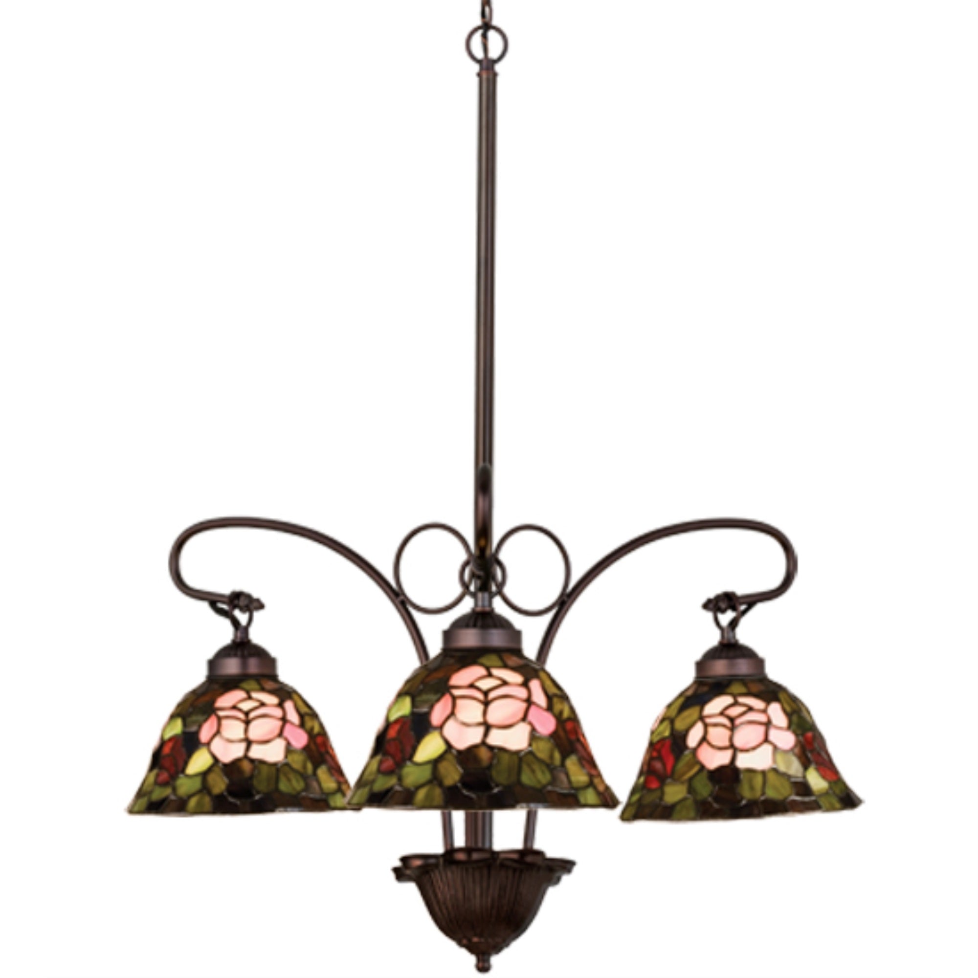 27418 24'W Tiffany Rosebush 3 Lt Chandelier.602 Manufacturer By Meyda. The Most Beloved Of All Flowers; The Rose; Is Beautifully Represented In This Meyda Reproduction Of A Tiffany Studio Classic. Petal Pink; Romantic Red And Plum Passion Art Glass Roses Ramble On A Maze Of Garden Green Leaves. These Delicate Domed Stained Glass Shades Are Paired With A Graceful; Hand Finished Mahogany Bronze Two Light Island Fixture. Lens Color : Ruby;Pink;Mauve;Green;Blue;Violet;Chocolate, Made In China