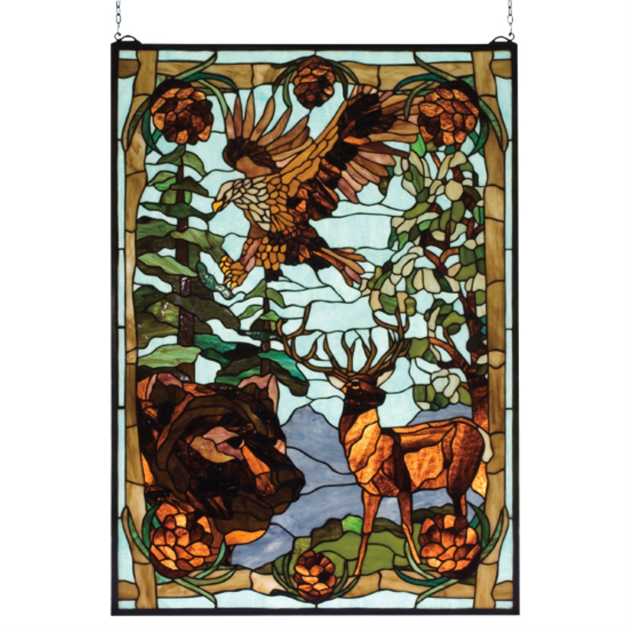 77732 25'W X 35'H Wilderness Stained Glass Window Manufacturer By Meyda. A Majestic Bronze Eagle Soars Above A Brown Bear And Deer Against A Blue Sky In A Picturesque Woodland Setting Of Pine Green And Earth Brown Framed In Branches And Pinecones. This Handsome Window Is Handcrafted Utilizing The Copperfoil Construction Process And Stained Art Glass Encased In A Solid Brass Frame. Mounting Bracket And Chain Are Included. Lens Color : Mauve;Amber Glass (Not Mica);Green;Blue;Chocolate, Made In China