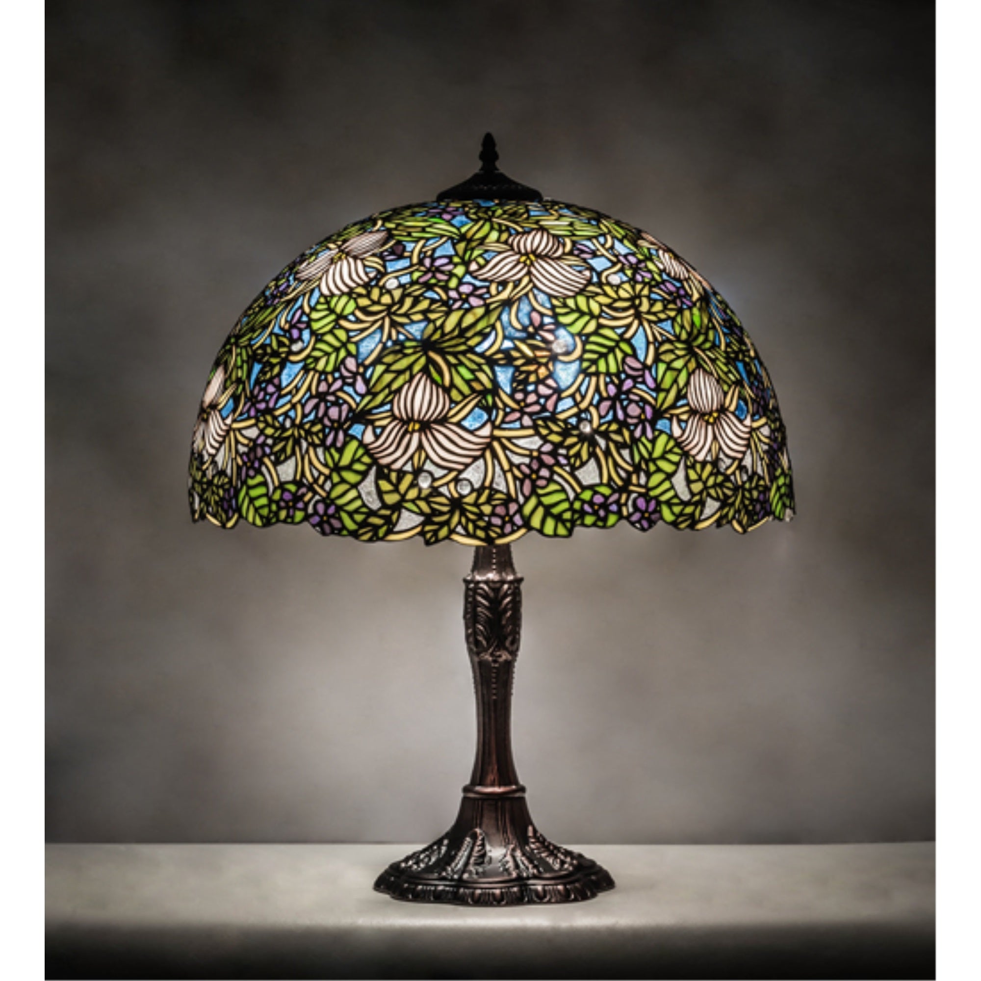 232797 26' High Trillium & Violet Table Lamp Manufacturer By Meyda. Nature Abounds In This Designer-Styled Stained Glass Shade. Clusters Of Violets With Woodland Green Leaves Offer Protection On The Forest Floor To The Delicate Ivory Trilliums; While Amber Vines Twist And Turn Through A Background Of Sky Blue And Clear Seeded Glass. Clear Jewels Glisten Throughout The Shade Like The First Dew Drops Of The Day. Each Piece Of Glass In The Shade Is Hand Cut And Wrapped Using The Famous Meyda Tiffany Copperfoil Construction. The Table Lamp Base Is Hand Finished In Mahogany Bronze. Ul And Cul Listed For Dry Locations. Lens Color : Green, Made In China