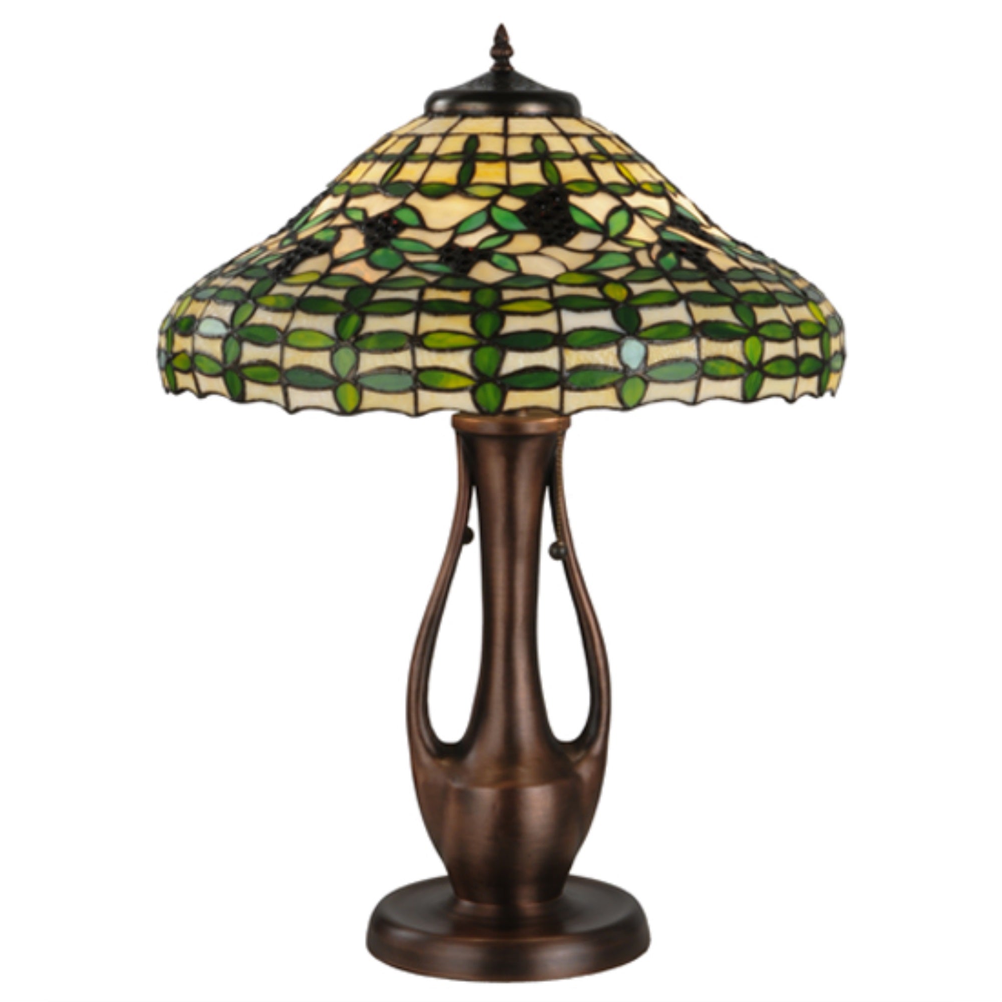 139418 27'H Guirnalda Table Lamp Manufacturer By Meyda. A Flourish Of Spring Green Leaves Surrounds A Cluster Of Amethyst Grapes. A Four Petaled Design Aligns In Symmetrical Rows Against A Bone Beige Art Glass Background. Garden Inspired Designs Were Among The Favored Subjects Of Tiffany Studios Back In The Day. This Beautiful Shade Was Created Using Meyda'S Famous Copperfoil Construction And Is Paired With A Table Base Is Finished In A Warm Hand Applied Mahogany Bronze. Lens Color : Green;Violet;Beige, Made In China