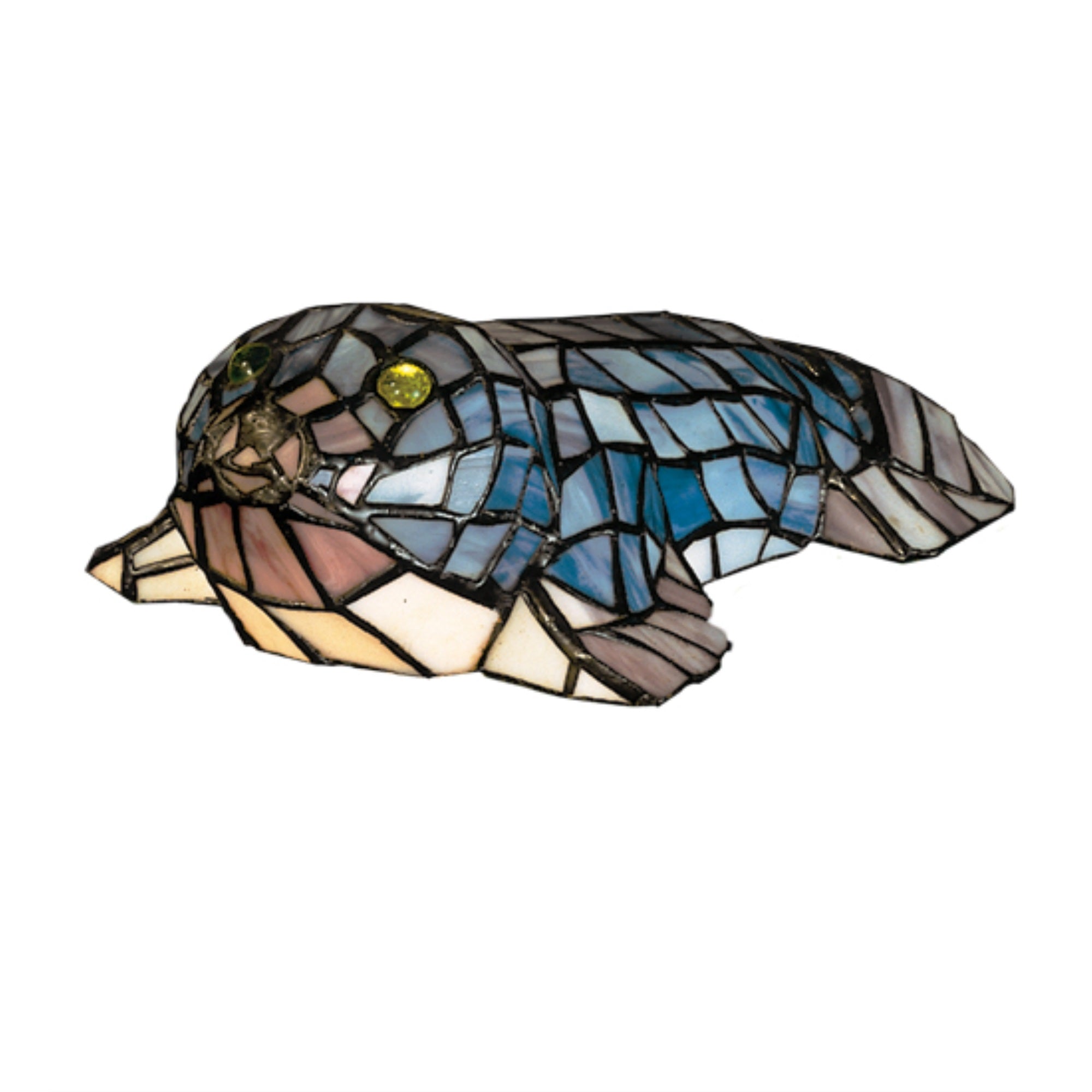 16445 3.5'H Tiffany Seal Accent Lamp Manufacturer By Meyda. The Adorable Charm Of A Baby Seal Comes Down From The Arctic And Into Your Home. Standing Only 3.5 Inches High; And 10 Inches Long This Accent Lamp Is Ideal For Any Child'S Bedroom; Playroom Or Other Playful Spaces. This Beautiful Accent Lamp Comes To Life With A Mixture Of Blue; Gray; Purple; And White Stained Glass Pieces And Accented By Glistening Green Glass Jewel Eyes. This Accent Lamp Is Made With Tiffany'S Famous Copper Foil Construction. Lens Color : Pink;Mauve;Charcoal, Made In China