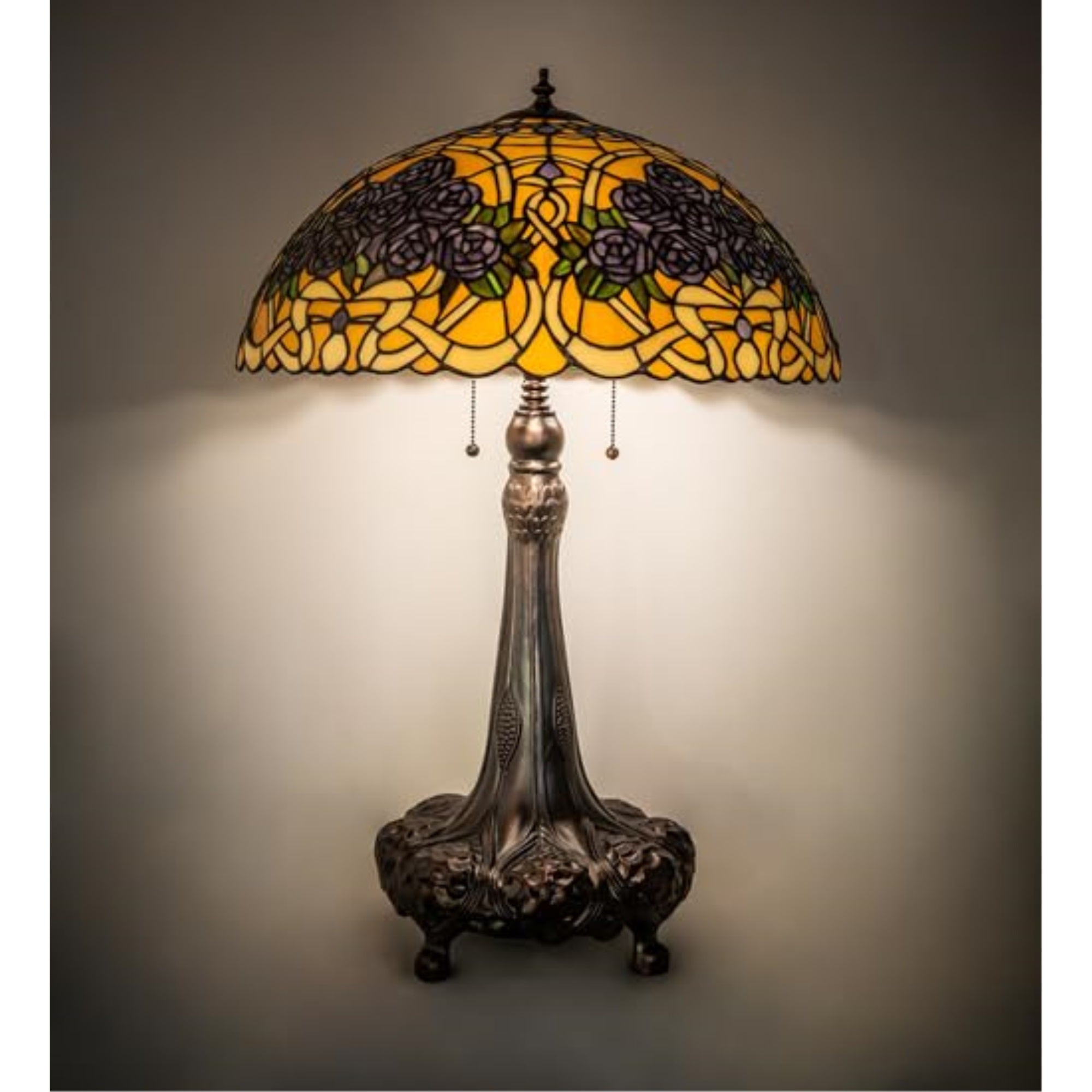 Beautiful Bouquets Of Full-Blooming Lavender Roses Circle This Exquisite Stained Glass Shade. The Roses Are Accented With Green Leaves Against A Nouveau-Styled Scrolled Background Design. The Delicate Domed Shade Is Paired With An Elegant Cast Metal Lamp Base Hand-Finished In Mahogany Bronze. The Handcrafted Shade Is Created Using The Famous Meyda Tiffany Copperfoil Construction Technique. The Lamp Is Ideal For Placement In Picture Windows And On Credenzas And End Tables To Make A Beautiful Design Statement In Residential And Hospitality Spaces; From Atlanta; Georgia; To Miami; Florida; To St. Louis; Missouri. The Rose Bouquet Table Lamp Is Featured In Our American-Designed; Handmade Stained Glass Lighting Collection. Ul And Cul Listed For Dry Locations.?Each Shade Is A Unique Work Of Art With Color Variations Based On Natural Ingredients Inherent In The Glass.